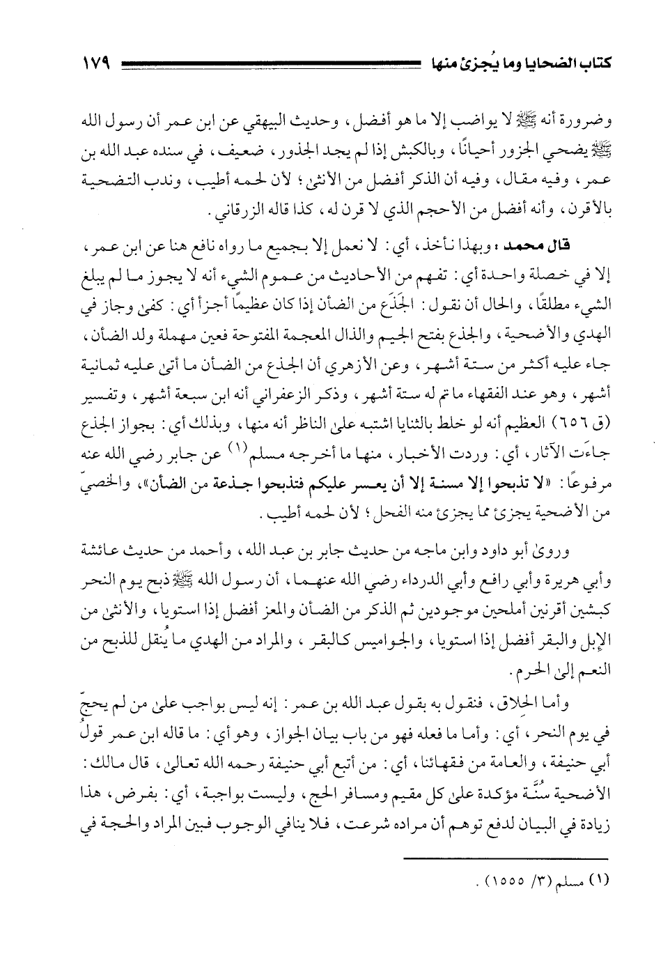 وأما الحِلاق، فنقول به بقول عبد الله بن عمر: إنه ليس بواجب على من لم يحجّ في يوم النحر، أي: وأما ما فعله فهو من باب بيان الجواز، وهو أي: ما قاله ابن عمر قولُ أبي حنيفة، والعامة من فقهائنا، أي: من أتبع أبي حنيفة رحمه الله تعالى، قال مالك: الأضحية سُنَّة مؤكدة على كل مقيم ومسافر الحج، وليست بواجبة، أي: بفرض، هذا زيادة في البيان لدفع توهم أن مراده شرعت، فلا ينافي الوجوب فبين المراد والحجة في