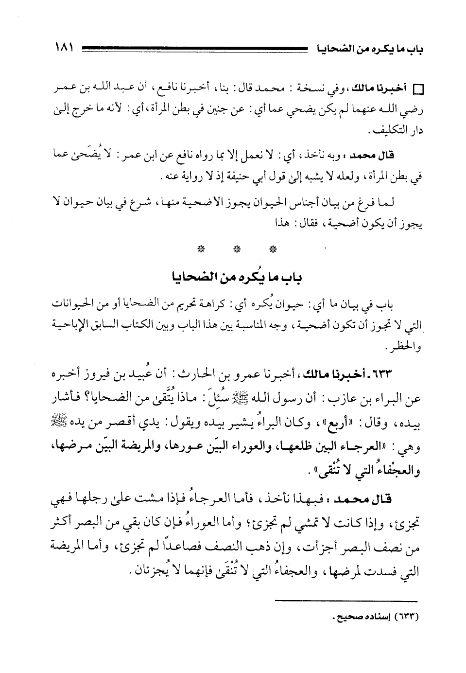 633 - أخبرنا مالك، أخبرنا عمرو بن الحارث: أن عُبيد بن فيروز أخبره عن البراء بن عازب: أن رسول الله - صلى الله عليه وسلم - سُئِلَ: ماذا يُتَّقى من الضحايا؟ فأشار بيده، وقال: "أربع"، وكان البراءُ يشير بيده ويقول: يدي أقصر من يده - صلى الله عليه وسلم - وهي: "العرجاء البين ظلعها، والعوراء البيّن عورها، والمريضة البيّن مرضها، والعجْفاءُ التي لا تُنْقى".