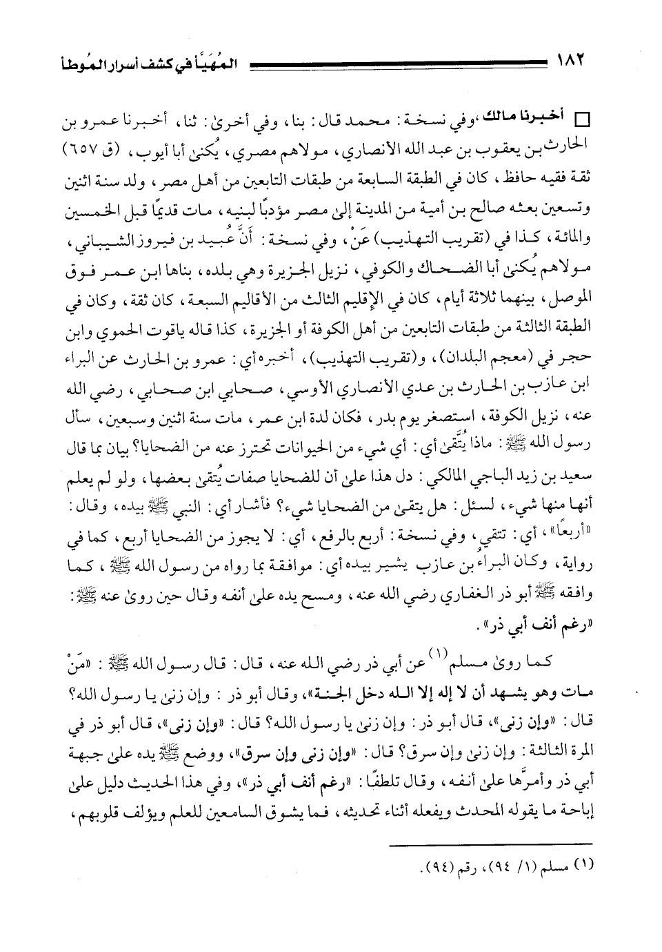 • أخبرنا مالك، وفي نسخة: محمد قال: بنا، وفي أخرى: ثنا، أخبرنا عمرو بن الحارث بن يعقوب بن عبد الله الأنصاري، مولاهم مصري، يُكنى أبا أيوب، (ق 657) ثقة فقيه حافظ، كان في الطبقة السابعة من طبقات التابعين من أهل مصر، ولد سنة اثنين وتسعين بعثه صالح بن أمية من المدينة إلى مصر مؤدبًا لبنيه، مات قديمًا قبل الخمسين والمائة، كذا في (تقريب التهذيب) عَنْ، وفي نسخة: أَنَّ عُبيد بن فيروز الشيباني، مولاهم يُكنى أبا الضحاك والكوفي، نزيل الجزيرة وهي بلده، بناها ابن عمر فوق الموصل، بينهما ثلاثة أيام، كان في الإِقليم الثالث من الأقاليم السبعة، كان ثقة، وكان في الطبقة الثالثة من طبقات التابعين من أهل الكوفة أو الجزيرة، كذا قاله ياقوت الحموي وابن حجر في (معجم البلدان)، و (تقريب التهذيب)، أخبره أي: عمرو بن الحارث عن البراء بن عازب بن الحارث بن عدي الأنصاري الأوسي، صحابي ابن صحابي، رضي الله عنه، نزيل الكوفة، استصغر يوم بدر، فكان لدة ابن عمر، مات سنة اثنين وسبعين، سأل رسول الله - صلى الله عليه وسلم -: ماذا يُتَّقى أي: أي شيء من الحيوانات تحترز عنه من الضحايا؟ بيان بما قال سعيد بن زيد الباجي المالكي: دل هذا على أن للضحايا صفات يُتقى بعضها، ولو لم يعلم أنها منها شيء، لسئل: هل يتقى من الضحايا شيء؟ فأشار أي: النبي - صلى الله عليه وسلم - بيده، وقال: "أربعًا", أي: تتقي، وفي نسخة: أربع بالرفع، أي: لا يجوز من الضحايا أربع، كما في رواية، وكان البراءُ بن عازب يشير بيده أي: موافقة بما رواه من رسول الله - صلى الله عليه وسلم -، كما وافقه - صلى الله عليه وسلم - أبو ذر الغفاري رضي الله عنه، ومسح يده على أنفه وقال حين روى عنه - صلى الله عليه وسلم -: "رغم أنف أبي ذر".