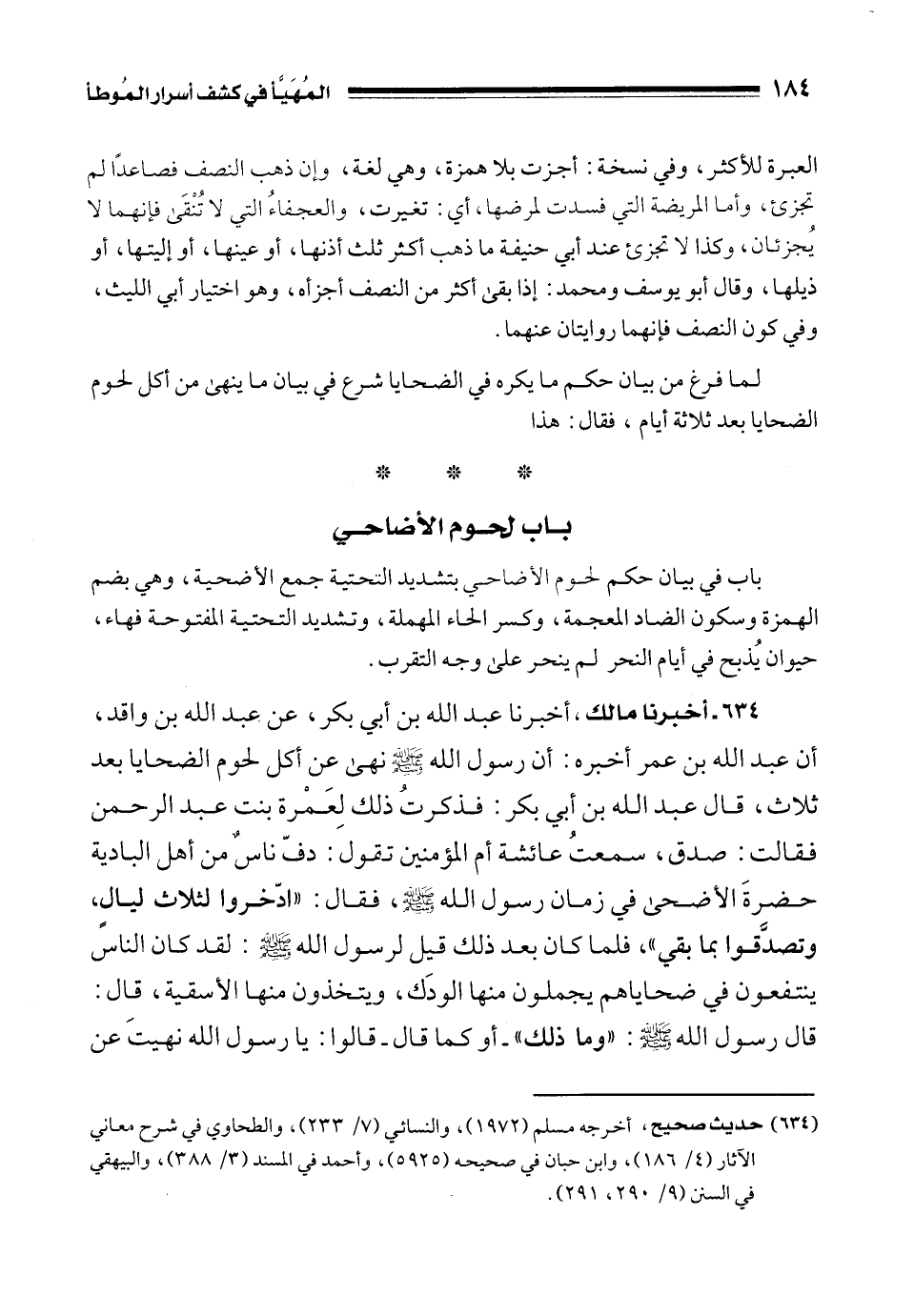 634 - أخبرنا مالك، أخبرنا عبد الله بن أبي بكر، عن عبد الله بن واقد، أن عبد الله بن عمر أخبره: أن رسول الله - صلى الله عليه وسلم - نهى عن أكل لحوم الضحايا بعد ثلاث، قال عبد الله بن أبي بكر: فذكرتُ ذلك لِعَمْرة بنت عبد الرحمن فقالت: صدق، سمعتُ عائشة أم المؤمنين تقول: دفّ ناسٌ من أهل البادية حضرةَ الأضحى في زمان رسول الله - صلى الله عليه وسلم -، فقال: "ادّخروا لثلاث ليالٍ، وتصدَّقوا بما بقي"، فلما كان بعد ذلك قيل لرسول الله - صلى الله عليه وسلم -: لقد كان الناس ينتفعون في ضحاياهم يجملون منها الودَك، ويتخذون منها الأسقية، قال: قال رسول الله - صلى الله عليه وسلم -: "وما ذلك" - أو كما قال - قالوا: يا رسول الله نهيتَ عن