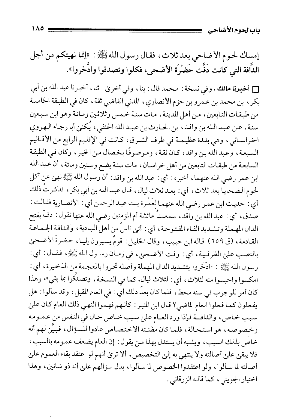 • أخبرنا مالك, وفي نسخة: محمد قال: بنا، وفي أخرى: ثنا، أخبرنا عبد الله بن أبي بكر، بن محمد بن عمرو بن حزم الأنصاري، المدني القاضي ثقة، كان في الطبقة الخامسة من طبقات التابعين، من أهل المدينة، مات سنة خمس وثلاثين ومائة وهو ابن سبعين سنة، عن عبد الله بن واقد، بن الحارث بن عبد الله الحنفي، يُكنى أبا رجاء الهروي الخراساني، وهي بلدة عظيمة في طرف الشرق، كانت في الإِقليم الرابع من الأقاليم السبعة، وعبد الله بن واقد، كان ثقة، وموصوفًا بخصال من الخير، وكان في الطبقة السابعة من طبقات التابعين من أهل خراسان، مات سنة بضع وستين ومائة، أن عبد الله بن عمر رضي الله عنهما، أخبره: أي: عبد الله بن واقد: أن رسول الله - صلى الله عليه وسلم - نهى عن أكل لحوم الضحايا بعد ثلاث، أي: بعد ثلاث ليال، قال عبد الله بن أبي بكر، فذكرتُ ذلك أي: حديث ابن عمر رضي الله عنهما لِعَمْرة بنت عبد الرحمن أي: الأنصارية فقالت: صدق، أي: عبد الله بن واقد، سمعتُ عائشة أم المؤمنين رضي الله عنها تقول: دفّ بفتح الدال المهملة وتشديد الفاء المفتوحة، أي: أتى ناسٌ من أهل البادية، والدافة الجماعة القادمة، (ت 659) قاله ابن حبيب، وقال الخليل: قومٌ يسيرون إلينا، حضرةَ الأضحى بالنصب على الظرفية، أي: وقت الأضحى، في زمان رسول الله - صلى الله عليه وسلم -، فقال: أي: رسول الله - صلى الله عليه وسلم -: "ادّخروا بتشديد الدال المهملة وأصله تحروا بالمعجمة من الذخيرة، أي: امكسوا واحبسوا منه لثلاث، أي: لثلاث ليالٍ، كما في النسخة، وتصدَّقوا بما بقي"، وهذا كان أمر للوجوب في سنه محط، فلما كان بعد ذلك أي: في العام المقبل، وقد سألوا: هل يفعلون كما فعلوا العام الماضي؟ قال ابن المنير: كأنهم فهموا النهي ذلك العام كان على سبب خاص، والدافة فإذا ورد العام على سبب خاص حال في النفس من عمومه وخصوصه، هو استحالة، فلما كان مظنته الاختصاص عادوا للسؤال، فبيَّن لهم أنه خاص بذلك السبب، ويشبه أن يستدل بهذا من يقول: إن العام يضعف عمومه بالسبب، فلا يبقى على أصالته ولا ينتهي به إلى التخصيص، ألا ترى أنهم لو اعتقد بقاء العموم على أصالته لما سألوا، ولو اعتقدوا الخصوص لما سألوا، بدل سؤالهم على أنه ذو شانين، وهذا اختيار الجويني، كما قاله الزرقاني.