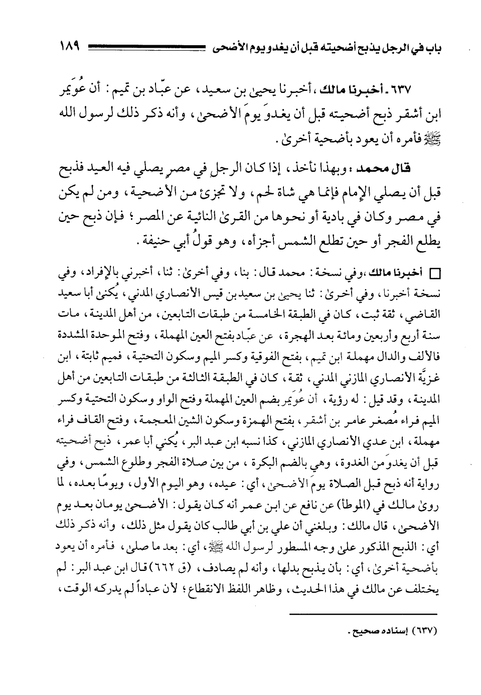 637 - أخبرنا مالك، أخبرنا يحيى بن سعيد، عن عبّاد بن تميم: أن عُوَيمر بن أشقر ذبح أضحيته قبل أن يغدوَ يومَ الأضحى، وأنه ذكر ذلك لرسول الله - صلى الله عليه وسلم - فأمره أن يعود بأضحية أخرى.