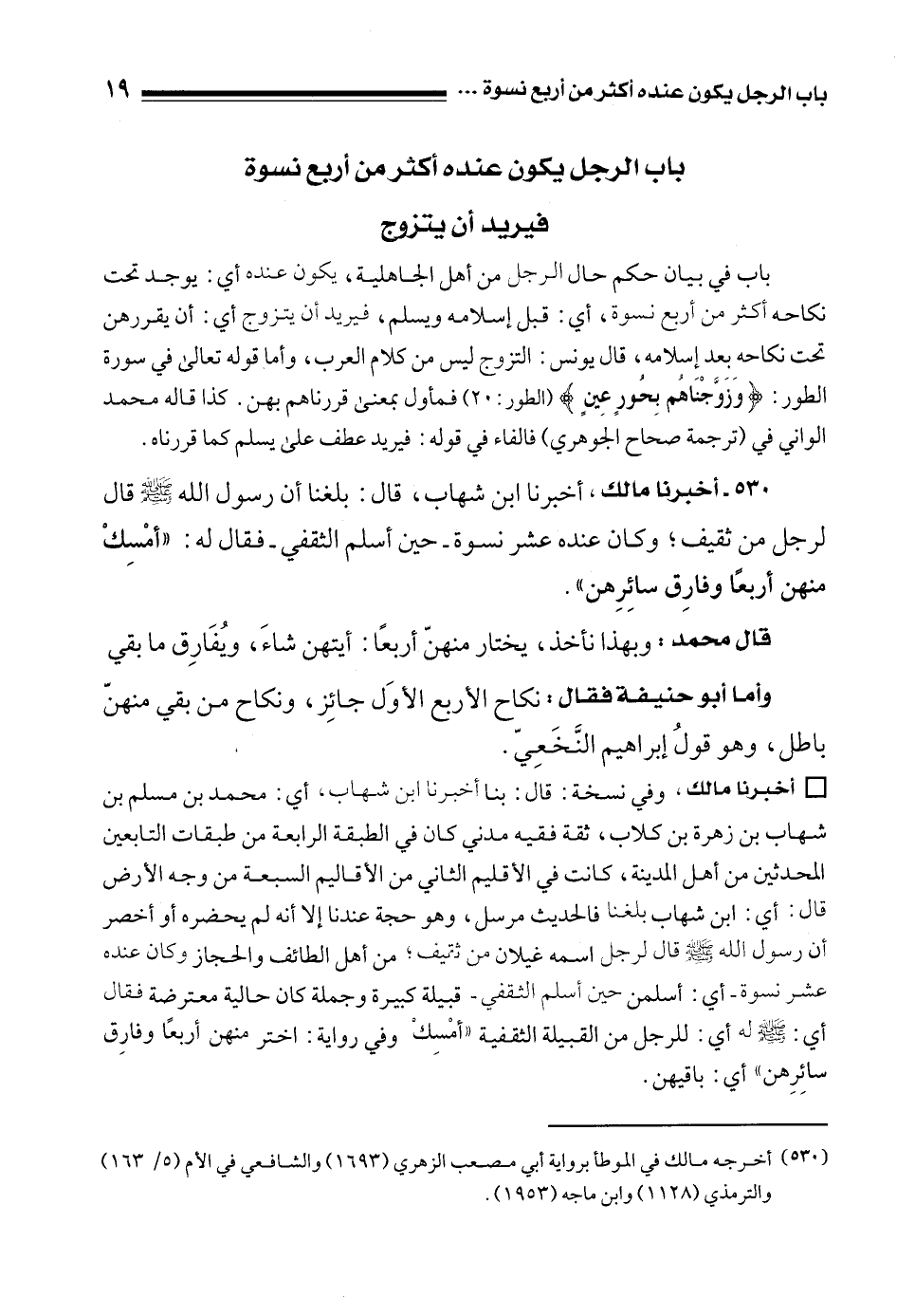 530 - أخبرنا مالك، أخبرنا ابن شهاب، قال: بلغنا أن رسول الله - صلى الله عليه وسلم - قال لرجل من ثقيف؛ وكان عنده عشر نسوة - حين أسلم الثقفي - فقال له: "أمْسِكْ منهن أربعًا وفارِق سائِرِهن".