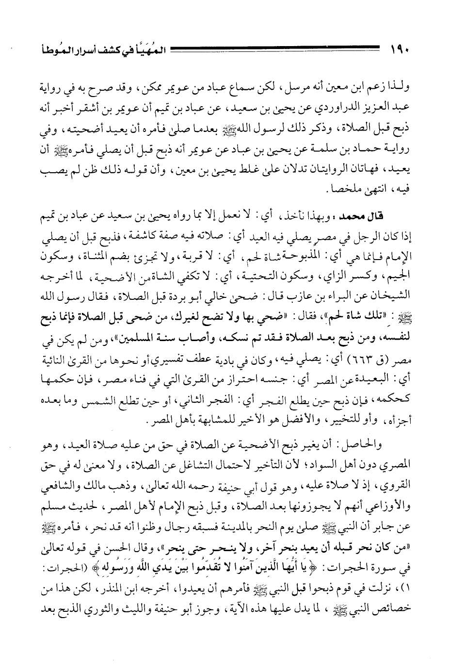 قال محمد: وبهذا نأخذ، أي: لا نعمل إلا بما رواه يحيى بن سعيد عن عباد بن تميم إذا كان الرجل في مصر يصلي فيه العيد أي: صلاته فيه صفة كاشفة، فذبح قبل أن يصلي الإِمام فإنما هي أي: المذبوحة شاة لحم، أي: لا قربة، ولا تجزئ بضم المثناة، وسكون الجيم، وكسر الزاي، وسكون التحتية، أي: لا تكفي الشاة من الأضحية، لما أخرجه الشيخان عن البراء بن عازب قال: ضحى خالي أبو بردة قبل الصلاة، فقال رسول الله - صلى الله عليه وسلم -: "تلك شاة لحم"، فقال: "ضحي بها ولا تضح لغيرك، من ضحى قبل الصلاة فإنما ذبح لنفسه، ومن ذبح بعد الصلاة فقد تم نسكه، وأصاب سنة المسلمين"، ومن لم يكن في مصر (ق 663) أي: يصلي فيه، وكان في بادية عطف تفسيري أو نحوها من القرى النائية أي: البعيدة عن المصر أي: جنسه احتراز من القرى التي في فناء مصر، فإن حكمها كحكمه، فإن ذبح حين يطلع الفجر أي: الفجر الثاني، أو حين تطلع الشمس وما بعده أجزأه، وأو للتخيير، والأفضل هو الأخير للمشابهة بأهل المصر.