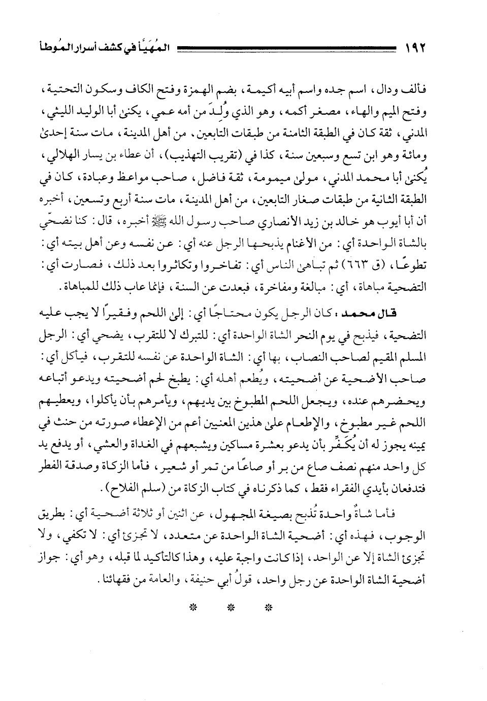 قال محمد: كان الرجل يكون محتاجًا أي: إلى اللحم وفقيرًا لا يجب عليه التضحية، فيذبح في يوم النحر الشاة الواحدة أي: للتبرك لا للتقرب، يضحي أي: الرجل المسلم المقيم لصاحب النصاب، بها أي: الشاة الواحدة عن نفسه للتقرب، فيأكل أي: صاحب الأضحية عن أضحيته، ويُطعم أهله أي: يطبخ لحم أضحيته ويدعو أتباعه ويحضرهم عنده، ويجعل اللحم المطبوخ بين يديهم، ويأمرهم بأن يأكلوا، ويعطيهم اللحم غير مطبوخ، والإِطعام على هذين المعنيين أعم من الإِعطاء صورته من حنث في يمينه يجوز له أن يُكَفِّر بأن يدعو بعشرة مساكين ويشبعهم في الغداة والعشي، أو يدفع يد كل واحد منهم نصف صاع من بر أو صاعًا من تمر أو شعير، فأما الزكاة وصدقة الفطر فتدفعان بأيدي الفقراء فقط، كما ذكرناه في كتاب الزكاة من (سلم الفلاح).