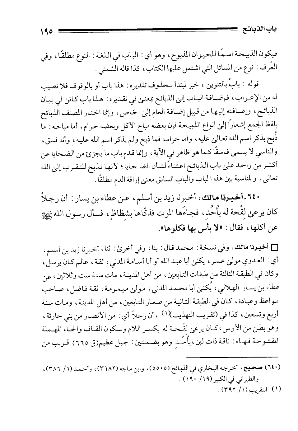 640 - أخبرنا مالك، أخبرنا زيد بن أسلم، عن عطاء بن يسار: أن رجلًا كان يرعى لِقْحة له بأُحُدِ، فجاءَها الموت فذكّاها بشِظاظٍ، فسأل رسول الله - صلى الله عليه وسلم - عن أكلها، فقال: "لا بأس بها فكلوها".