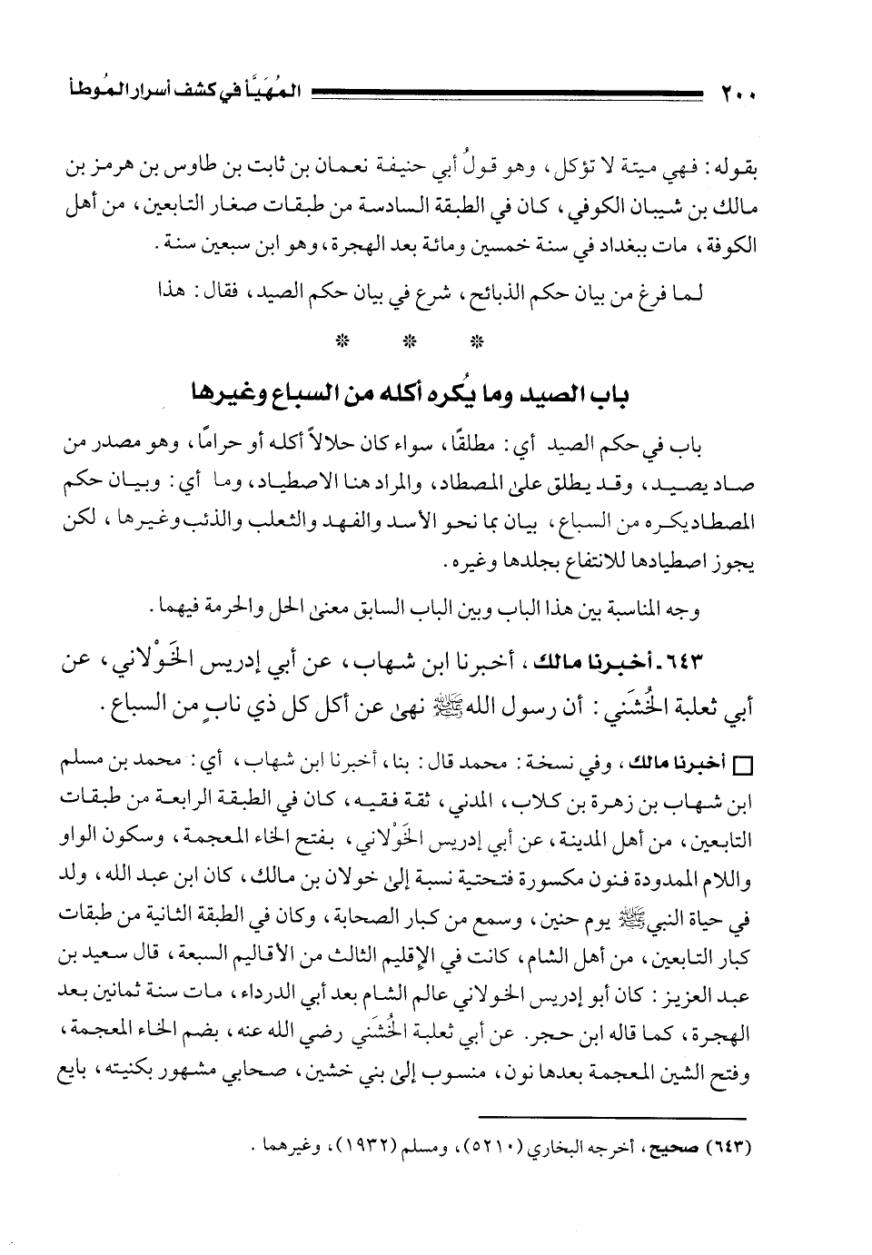 • أخبرنا مالك، وفي نسخة: محمد قال: بنا، أخبرنا ابن شهاب، أي: محمد بن مسلم بن شهاب بن زهرة بن كلاب، المدني، ثقة فقيه، كان في الطبقة الرابعة من طبقات التابعين، من أهل المدينة، عن أبي إدريس الخَوْلاني، بفتح الخاء المعجمة، وسكون الواو واللام الممدودة فنون مكسورة فتحتية نسبة إلى خولان بن مالك، كان ابن عبد الله، ولد في حياة النبي - صلى الله عليه وسلم - يوم حنين، وسمع من كبار الصحابة، وكان في الطبقة الثانية من طبقات كبار التابعين، من أهل الشام، كانت في الإِقليم الثالث من الأقاليم السبعة، قال سعيد بن عبد العزيز: كان أبو إدريس الخولاني عالم الشام بعد أبي الدرداء، مات سنة ثمانين بعد الهجرة، كما قاله ابن حجر. عن أبي ثعلبة الخُشَني رضي الله عنه، بضم الخاء المعجمة، وفتح الشين المعجمة بعدها نون، منسوب إلى بني خشين، صحابي مشهور بكنيته، بايع