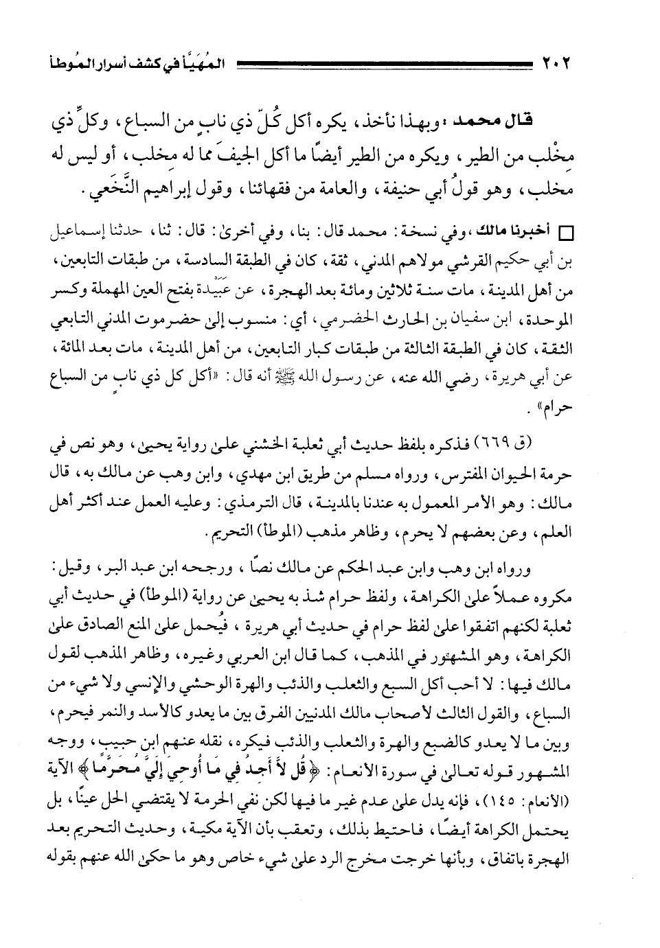 (ق 669) فذكره بلفظ حديث أبي ثعلبة الخشني على رواية يحيى، وهو نص في حرمة الحيوان المفترس، ورواه مسلم من طريق ابن مهدي، وابن وهب عن مالك به، قال مالك: وهو الأمر المعمول به عندنا بالمدينة، قال الترمذي: وعليه العمل عند أكثر أهل العلم، وعن بعضهم لا يحرم، وظاهر مذهب (الموطأ) التحريم.