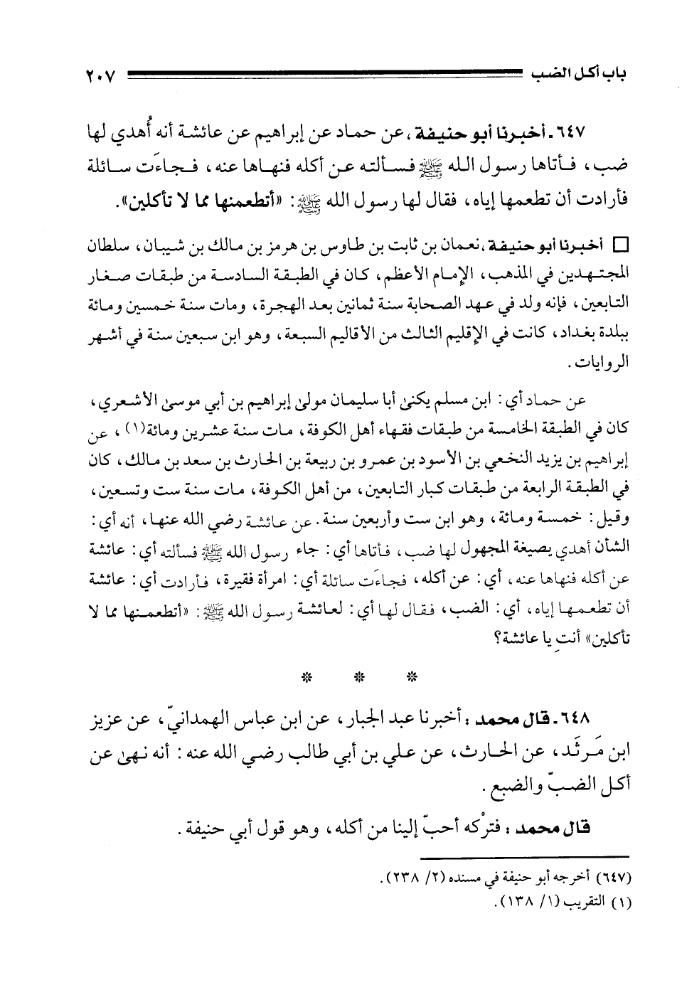 647 - أخبرنا أبو حنيفة، عن حماد عن إبراهيم عن عائشة أنه أُهدي لها ضب، فأتاها رسول الله - صلى الله عليه وسلم - فسألته عن أكله فنهاها عنه، فجاءَت سائلة فأرادت أن تطعمها إياه، فقال لها رسول الله - صلى الله عليه وسلم -: "أتطعمنها مما لا تأكلين".