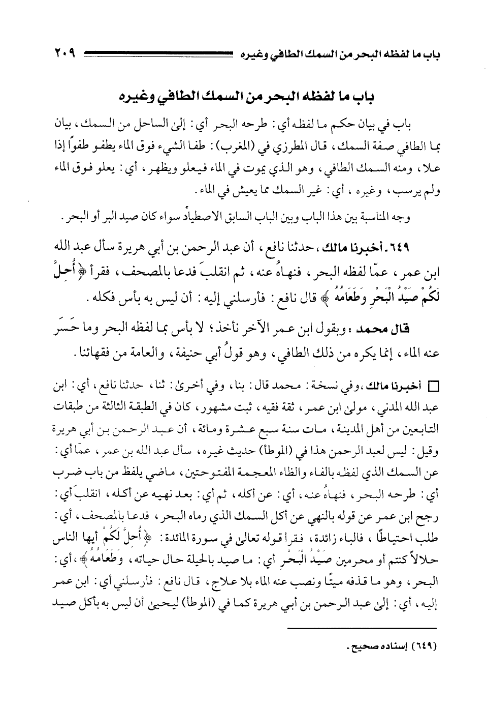 • أخبرنا مالك، وفي نسخة: محمد قال: بنا، وفي أخرى: ثنا، حدثنا نافع، أي: ابن عبد الله المدني، مولى ابن عمر، ثقة فقيه، ثبت مشهور، كان في الطبقة الثالثة من طبقات التابعين من أهل المدينة، مات سنة سبع عشرة ومائة، أن عبد الرحمن بن أبي هريرة وقيل: ليس لعبد الرحمن هذا في (الموطأ) حديث غيره، سأل عبد الده بن عمر، عمّا أي: عن السمك الذي لفظه بالفاء والظاء المعجمة المفتوحتين، ماضي يلفظ من باب ضرب أي: طرحه البحر، فنهاهُ عنه، أي: عن أكله، ثم أي: بعد نهيه عن أكله، انقلبَ أي: رجح ابن عمر عن قوله بالنهي عن أكل السمك الذي رماه البحر، فدعا بالمصحف، أي: طلب احتياطًا، فالباء زائدة، فقرأ قوله تعالى في سورة المائدة: {أُحِلَّ لَكُمْ} أيها الناس حلالًا كنتم أو محرمين صَيْدُ الْبَحْرِ أي: ما صيد بالحيلة حال حياته، {وَطَعَامُهُ}، أي: البحر، وهو ما قذفه ميتًا ونصب عنه الماء بلا علاج، قال نافع: فأرسلني أي: ابن عمر إليه، أي: إلى عبد الرحمن بن أبي هريرة كما في (الموطأ) ليحيى أن ليس به بأكل صيد