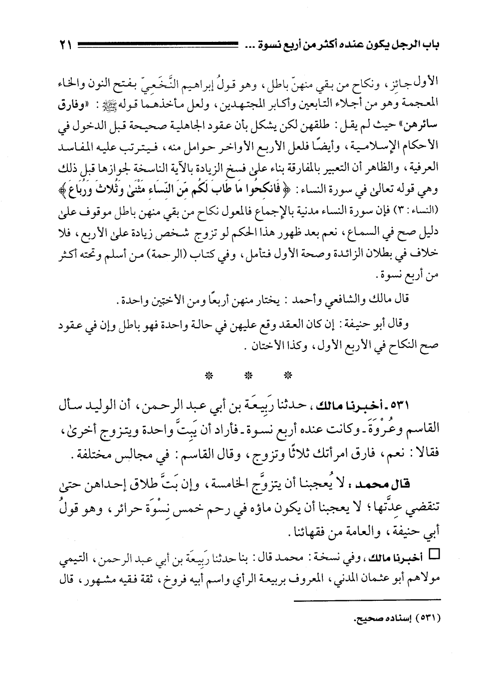 531 - أخبرنا مالك، حدثنا رَبِيعَة بن أبي عبد الرحمن، أن الوليد سأل القاسم وعُرْوَةَ - وكانت عنده أربع نسوة - فأراد أن يَبِتَّ واحدة ويتزوج أخرى، فقالا: نعم، فارق امرأتك ثلاثًا وتزوج، وقال القاسم: في مجالس مختلفة.