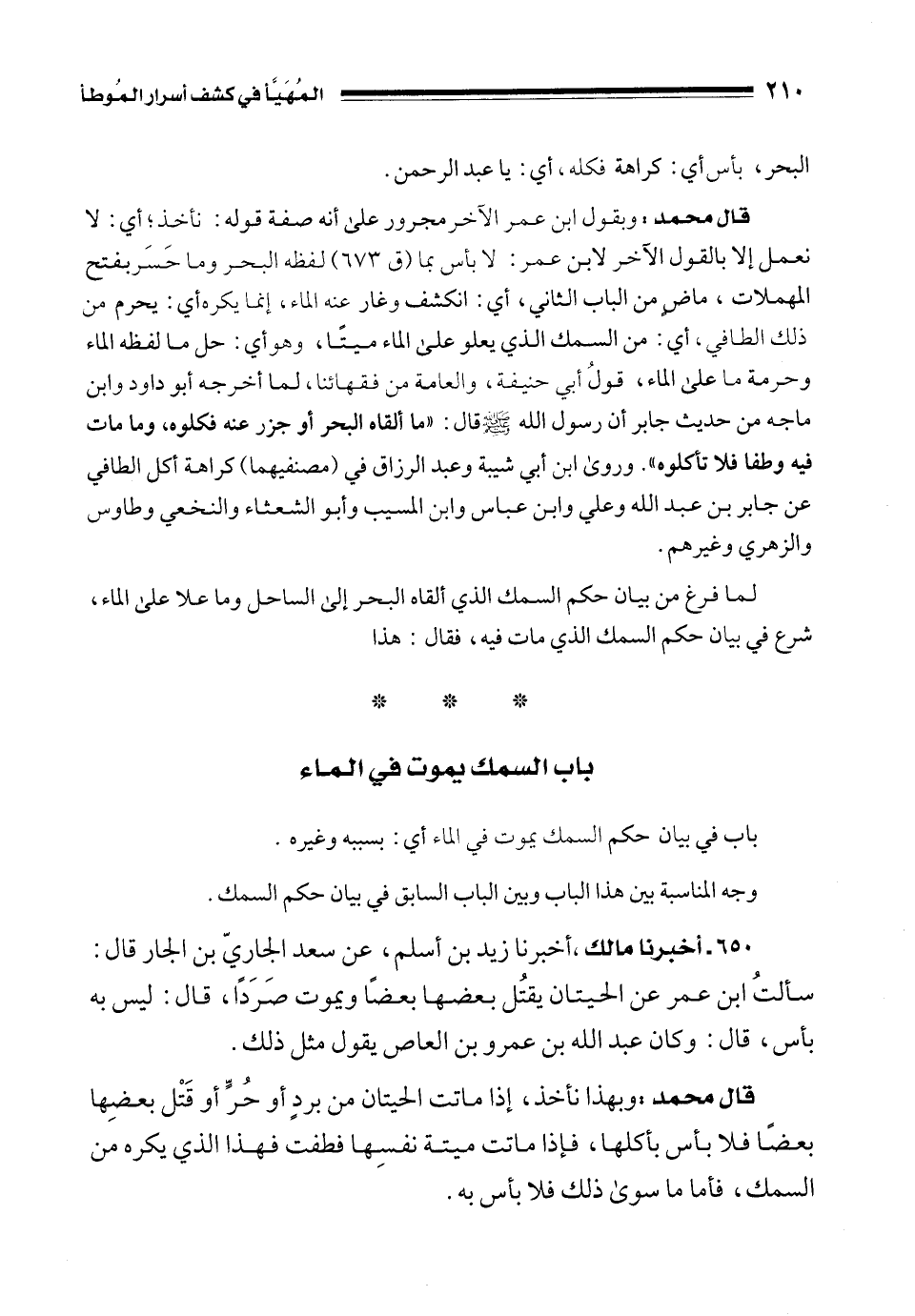 قال محمد: وبقول ابن عمر الآخر مجرور على أنه صفة قوله: نأخذ؛ أي: لا نعمل إلا بالقول الآخر لابن عمر: لا بأس بما (ق 673) لفظه البحر وما حَسَر بفتح المهملات، ماضٍ من الباب الثاني، أي: انكشف وغار عنه الماء، إنما يكره أي: يحرم من ذلك الطافي، أي: من السمك الذي يعلو على الماء ميتًا، وهو أي: حل ما لفظه الماء وحرمة ما على الماء، قولُ أبي حنيفة، والعامة من فقهائنا، لما أخرجه أبو داود وابن ماجه من حديث جابر أن رسول الله - صلى الله عليه وسلم - قال: "ما ألقاه البحر أو جزر عنه فكلوه، وما مات فيه وطفا فلا تأكلوه". وروى ابن أبي شيبة وعبد الرزاق في (مصنفيهما) كراهة أكل الطافي عن جابر بن عبد الله وعلي وابن عباس وابن المسيب وأبو الشعثاء والنخعي وطاوس والزهري وغيرهم.