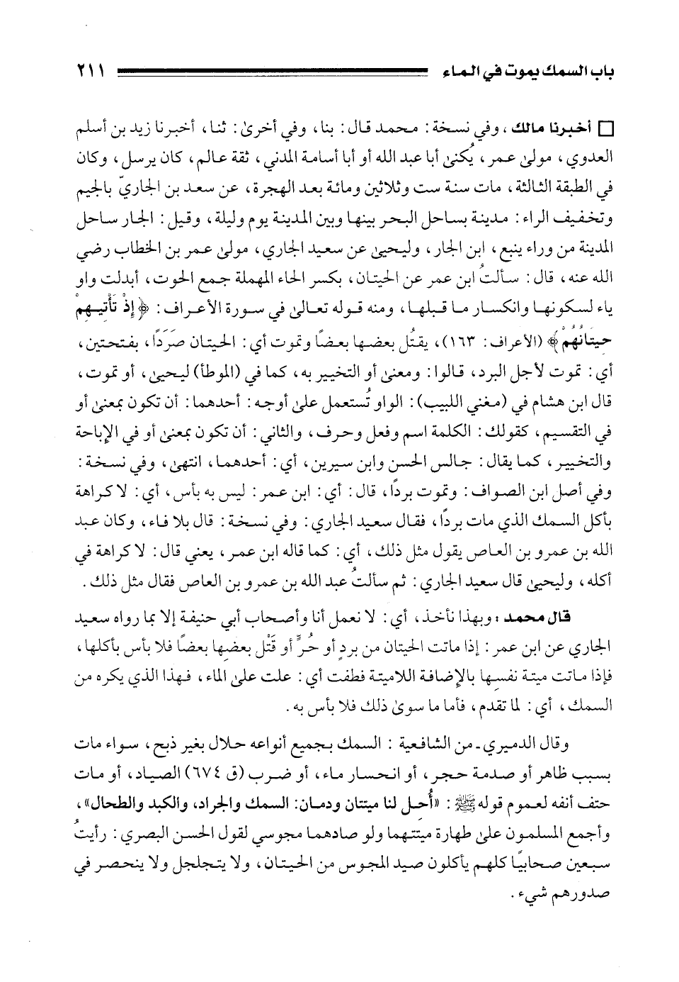 قال محمد: وبهذا نأخذ، أي: لا نعمل أنا وأصحاب أبي حنيفة إلا بما رواه سعيد الجاري عن ابن عمر: إذا ماتت الحيتان من بردٍ أو حُرٍّ أو قَتْل بعضِها بعضًا فلا بأس بأكلها، فإذا ماتت ميتة نفسِها بالإِضافة اللاميتة فطفت أي: علت على الماء، فهذا الذي يكره من السمك، أي: لما تقدم، فأما ما سوى ذلك فلا بأس به.