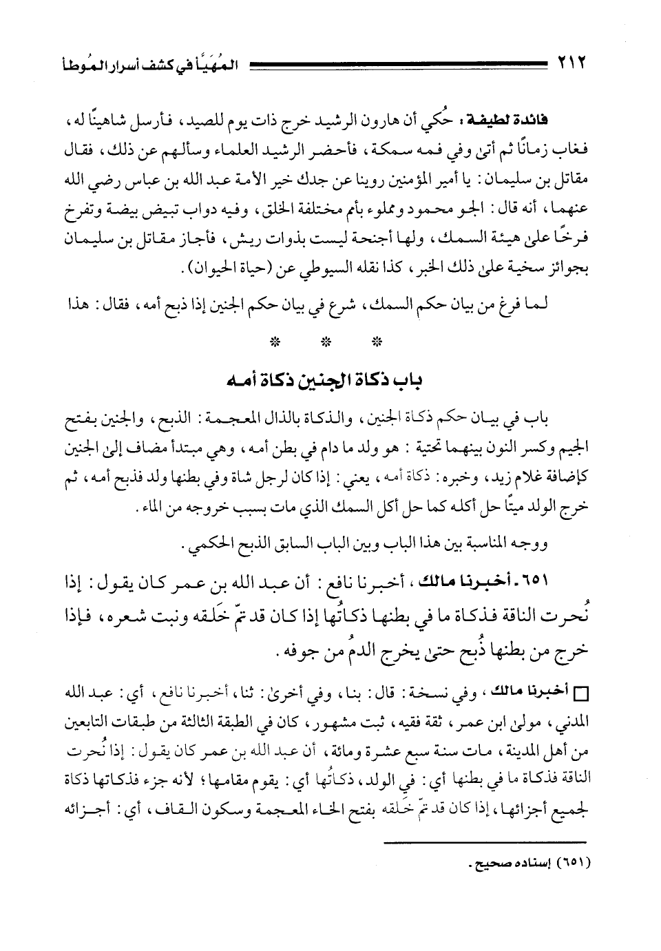 • أخبرنا مالك, وفي نسخة: قال: بنا، وفي أخرى: ثنا، أخبرنا نافع، أي: عبد الله المدني، مولى ابن عمر، ثقة فقيه، ثبت مشهور، كان في الطبقة الثالثة من طبقات التابعين من أهل المدينة، مات سنة سبع عشرة ومائة، أن عبد الله بن عمر كان يقول: إذا نُحرت الناقة فذكاة ما في بطنها أي: في الولد، ذكاتُها أي: يقوم مقامها؛ لأنه جزء فذكاتها ذكاة لجميع أجزائها، إذا كان قد تمّ خَلقه بفتح الخاء المعجمة وسكون القاف، أي: أجزائه