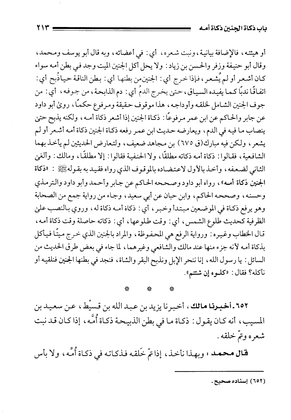 652 - أخبرنا مالك، أخبرنا يزيد بن عبد الله بن قسيْط، عن سعيد بن المسيب، أنه كان يقول: ذكاة ما في بطن الذبيحة ذكاة أُمَّه، إذا كان قد نبت شعره وتمّ خلقه.