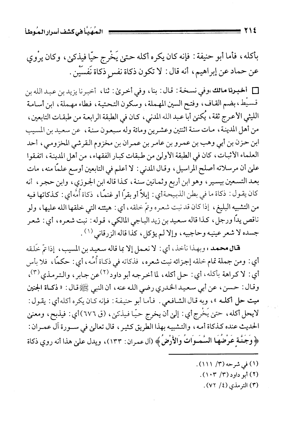 • أخبرنا مالك، وفي نسخة: قال: بنا، وفي أخرى: ثنا، أخبرنا يزيد بن عبد الله بن قسيْط، بضم القاف، وفتح السين المهملة، وسكون التحتية، فطاء مهملة، ابن أسامة الليثي الأعرج ثقة، يُكنى أبا عبد الله المدني، كان في الطبقة الرابعة من طبقات التابعين، من أهل المدينة، مات سنة اثنتين وعشرين ومائة وله سبعون سنة، عن سعيد بن المسيب بن حزن بن أبي وهب بن عمرو بن عامر بن عمران بن مخزوم القرشي المخزومي، أحد العلماء الأثبات، كان في الطبقة الأولى من طبقات كبار الفقهاء، من أهل المدينة، اتفقوا على أن مرسلاته أصلح المراسيل، وقال المدني: لا أعلم في التابعين أوسع علمًا منه، مات بعد التسعين بيسير، وهو ابن أربع وثمانين سنة، كذا قاله ابن الجوزي، وابن حجر، أنه كان يقول: ذكاة ما في بطن الذبيحة أي: إبلًا أو بقرًا أو غنمًا، ذكاة أُمَّه أي: كذكاتها فيه من التشبيه البليغ، إذا كان قد نبت شعره وتمّ خلقه، أي: هيئته التي خلقها الله عليها، ولو ناقص يدًا ورجل، كذا قاله سعيد بن زيد الباجي المالكي، قوله: نبت شعره، أي: شعر جسده لا شعر عينيه وحاجبيه، وإلا لم يؤكل، كذا قاله الزرقاني (¬1).