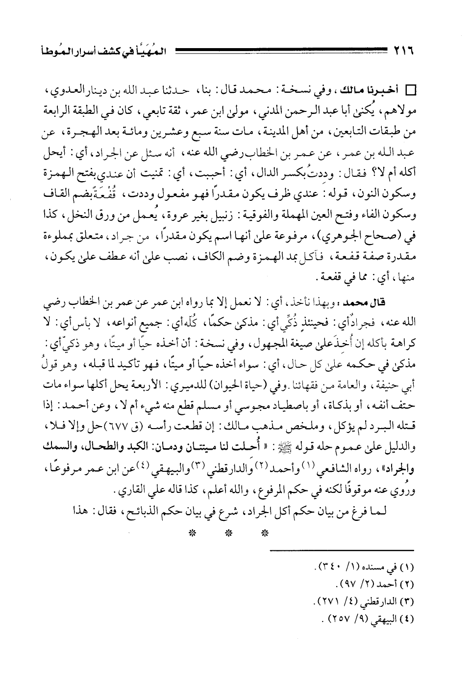 • أخبرنا مالك, وفي نسخة: محمد قال: بنا، حدثنا عبد الله بن دينار العدوي، مولاهم، يُكنى أبا عبد الرحمن المدني، مولى ابن عمر، ثقة تابعي، كان في الطبقة الرابعة من طبقات التابعين، من أهل المدينة، مات سنة سبع وعشرين ومائة بعد الهجرة، عن عبد الله بن عمر، عن عمر بن الخطاب رضي الله عنه، أنه سئل عن الجراد، أي: أيحل أكله أم لا؟ فقال: ودِدتُ بكسر الدال، أي: أحببت، أي: تمنيت أن عندي بفتح الهمزة وسكون النون، قوله: عندي ظرف يكون مقدرًا فهو مفعول وددت، قُفْعَةً بضم القاف وسكون الفاء وفتح العين المهملة والفوقية: زنبيل بغير عروة، يُعمل من ورق النخل، كذا في (صحاح الجوهري)، مرفوعة على أنها اسم يكون مقدرًا، من جراد، متعلق بمملوءة مقدرة صفة قفعة، فآكل بمد الهمزة وضم الكاف، نصب على أنه عطف على يكون، منها، أي: مما في قفعة.