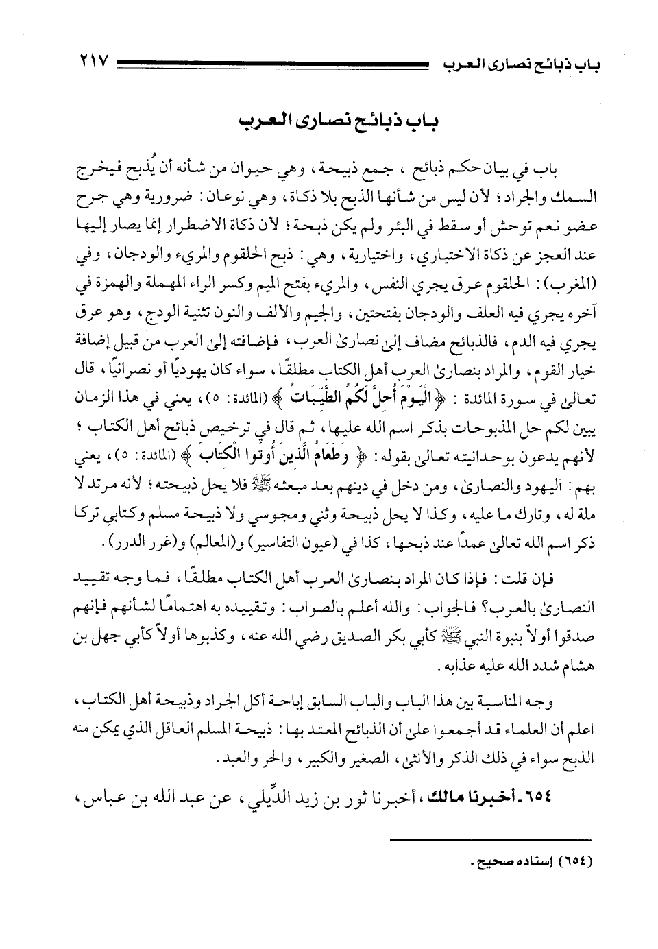 باب في بيان حكم ذبائح، جمع ذبيحة، وهي حيوان من شأنه أن يُذبح فيخرج السمك والجراد؛ لأن ليس من شأنها الذبح بلا ذكاة، وهي نوعان: ضرورية وهي جرح عضو نعم توحش أو سقط في البئر ولم يكن ذبحة؛ لأن ذكاة الاضطرار إنما يصار إليها عند العجز عن ذكاة إلاختياري، واختيارية، وهي: ذبح الحلقوم والمريء والودجان، وفي (المغرب): الحلقوم عرق يجري النفس، والمريء بفتح اليم وكسر الراء المهملة والهمزة في آخره يجري فيه العلف والودجان بفتحتين، والجيم والألف والنون تثنية الودج، وهو عرق يجري فيه الدم، فالذبائح مضاف إلى نصارى الحرب، فإضافته إلى العرب من قبيل إضافة خيار القوم، والمراد بنصارى العرب أهل الكتاب مطلقًا، سواء كان يهوديًا أو نصرانيًا، قال تعالى في سورة المائدة: {الْيَوْمَ أُحِلَّ لَكُمُ الطَّيِّبَاتُ} [المائدة: 5]، يعني في هذا الزمان يبين لكم حل المذبوحات بذكر اسم الله عليها، ثم قال في ترخيص ذبائح أهل الكتاب؛ لأنهم يدعون بوحدانيته تعالى بقوله: {وَطَعَامُ الَّذِينَ أُوتُوا الْكِتَابَ} [المائدة: 5]، يعني بهم: اليهود والنصارى، ومن دخل في دينهم بعد مبعثه - صلى الله عليه وسلم - فلا يحل ذبيحته؛ لأنه مرتد لا ملة له، وتارك ما عليه، وكذا لا يحل ذبيحة وثني ومجوسي ولا ذبيحة مسلم وكتابي تركا ذكر اسم الله تعالى عمدًا عند ذبحها، كذا في (عيون التفاسير) و (المعالم) و (غرر الدرر).