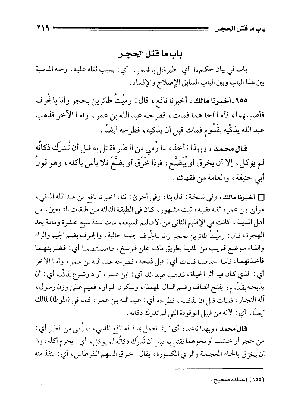 • أخبرنا مالك، وفي نسخة: قال بنا، وفي أخرى: ثنا، أخبرنا نافع بن عبد الله المدني، مولى ابن عمر، ثقة فقيه، ثبت مشهور، كان في الطبقة الثالثة من طبقات التابعين، من أهل المدينة، كانت في الإِقليم الثاني من الأقاليم السبعة، مات سنة سبع عشرة ومائة بعد الهجرة، قال: رميْتُ طائرين بحجر وأنا بالجُرف جملة حالية، والجرف بضم الجيم والراء والفاء موضع قريب من المدينة بطريق مكة على فرسخ، فأصبتهما أي: فضربتهما فأخذتهما، فأما أحدهما فمات أي: قبل ذبحه، فطرحه عبد الله بن عمر، وأما الآخر أي: الذي كان فيه أثر الحياة، فذهب عبد الله أي: ابن عمر، أراد وشرع يذكِّيه أي: أن يذبحه بقَدُوم، بفتح القاف وضم الدال المهملة، وسكون الواو، فميم على وزن رسول، آلة النجار، فمات قبل أن يذكيه، فطرحه أي: عبد الله بن عمر، كما في (الموطأ) لمالك أيضًا، أي: لأنه من قبيل الموقوذة التي لم تدرك ذكاته.