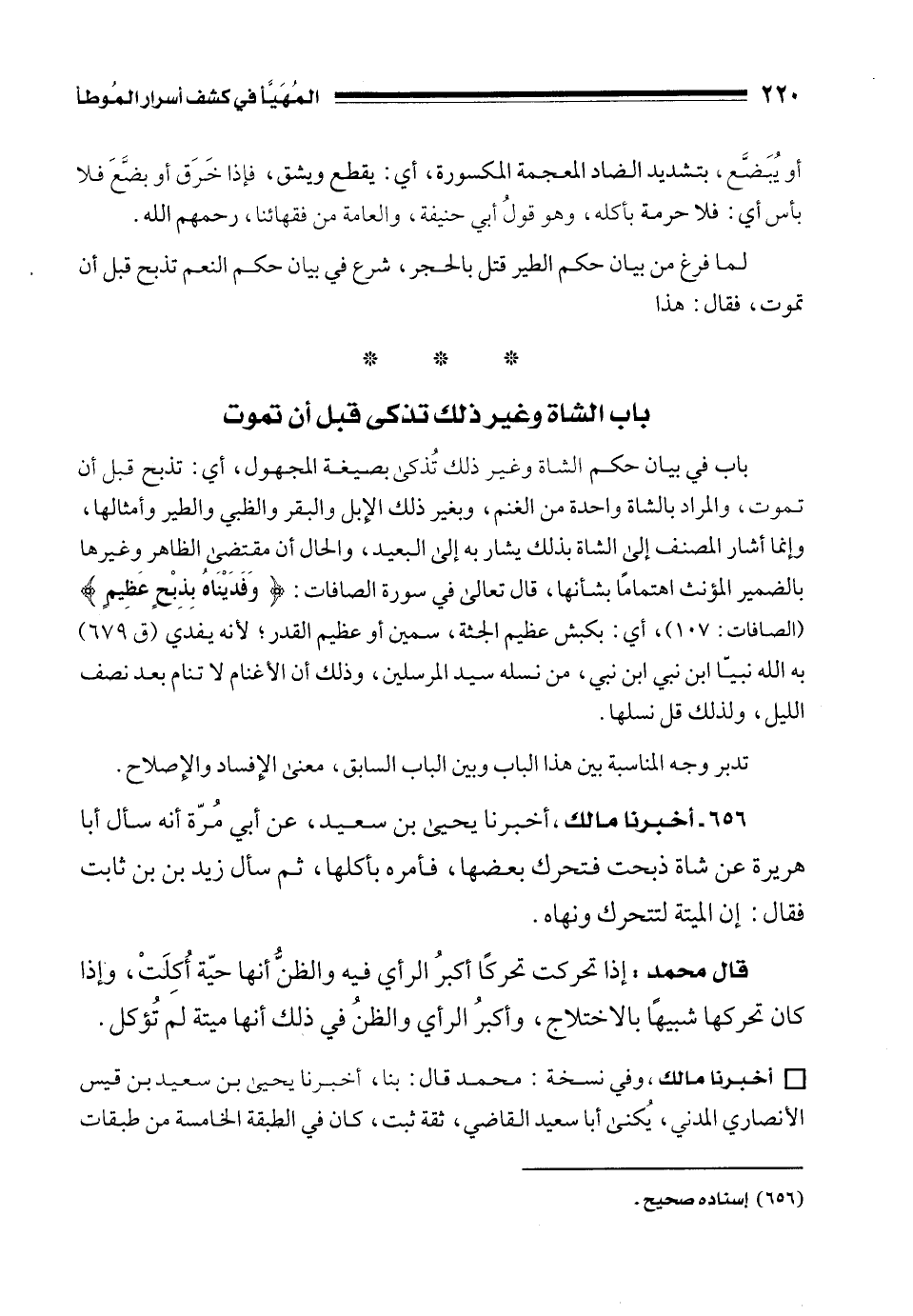 656 - أخبرنا مالك، أخبرنا يحيى بن سعيد، عن أبي مُرّة أنه سأل أبا هريرة عن شاة ذبحت فتحرك بعضها، فأمره بأكلها، ثم سأل زيد بن ثابت فقال: إن الميتة لتتحرك ونهاه.