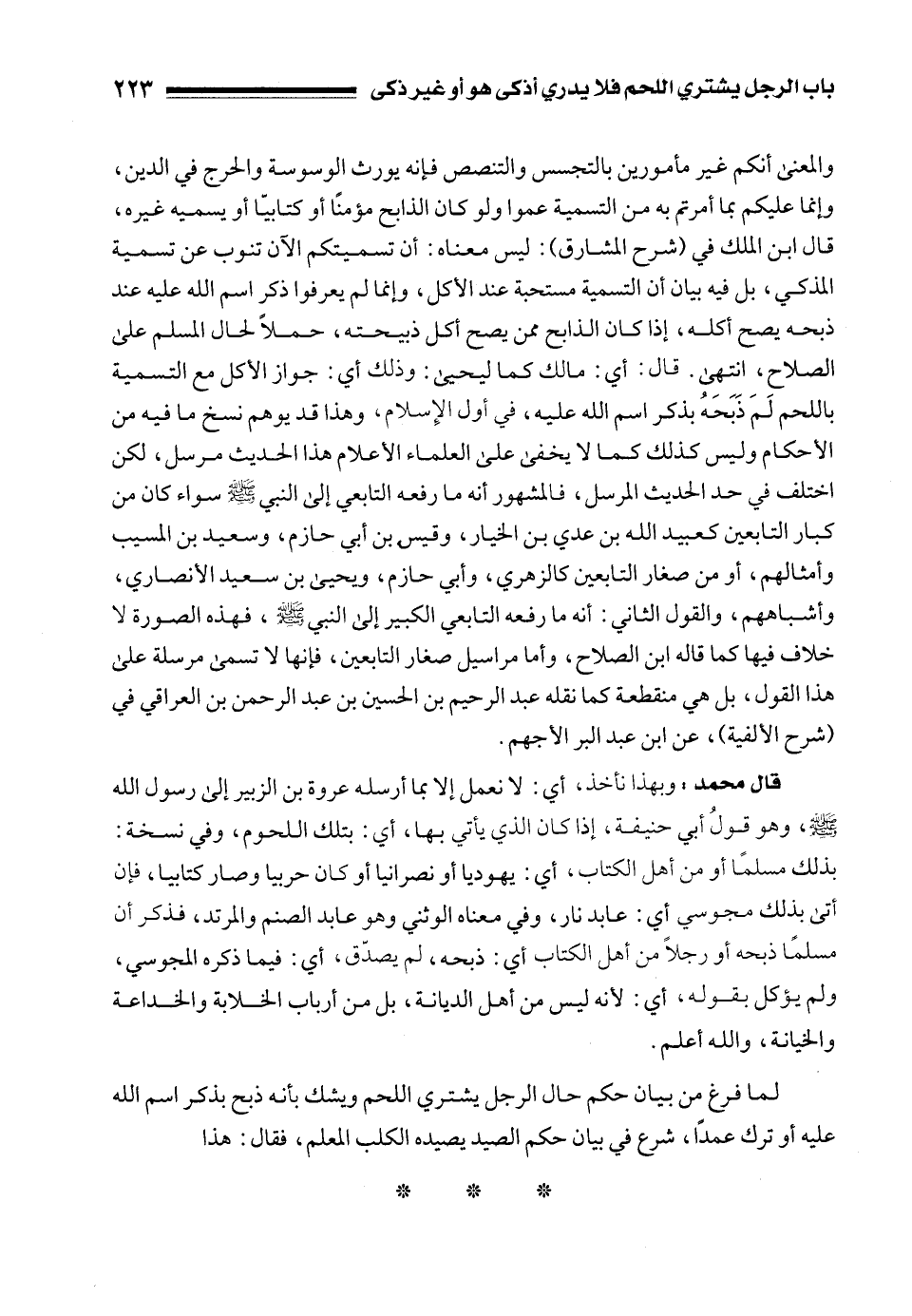 والمعنى أنكم غير مأمورين بالتجسس والتنصص فإنه يورث الوسوسة والحرج في الدين، وإنما عليكم بما أمرتم به من التسمية عموا ولو كان الذابح مؤمنًا أو كتابيّا أو يسميه غيره، قال ابن الملك في (شرح المشارق): ليس معناه: أن تسميتكم الآن تنوب عن تسمية المذكي، بل فيه بيان أن التسمية مستحبة عند الأكل، وإنما لم يعرفوا ذكر اسم الله عليه عند ذبحه يصح أكله، إذا كان الذابح ممن يصح أكل ذبيحته، حملًا لحال المسلم على الصلاح، انتهى. قال: أي: مالك كما ليحيى: وذلك أي: جواز الأكل مع التسمية باللحم لمَ ذَبَحَهُ بذكر اسم الله عليه، في أول الإِسلام, وهذا قد يوهم نسخ ما فيه من الأحكام وليس كذلك كما لا يخفى على العلماء الأعلام هذا الحديث مرسل، لكن اختلف في حد الحديث المرسل، فالمشهور أنه ما رفعه التابعي إلى النبي - صلى الله عليه وسلم - سواء كان من كبار التابعين كعبيد الله بن عدي بن الخيار، وقيس بن أبي حازم، وسعيد بن المسيب وأمثالهم، أو من صغار التابعين كالزهري، وأبي حازم، ويحيى بن سعيد الأنصاري، وأشباههم، والقول الثاني: أنه ما رفعه التابعي الكبير إلى النبي - صلى الله عليه وسلم -، فهذه الصورة لا خلاف فيها كما قاله ابن الصلاح، وأما مراسيل صغار التابعين، فإنها لا تسمى مرسلة على هذا القول، بل هي منقطعة كما نقله عبد الرحيم بن الحسين بن عبد الرحمن بن العراقي في (شرح الألفية)، عن ابن عبد البر الأجهم.