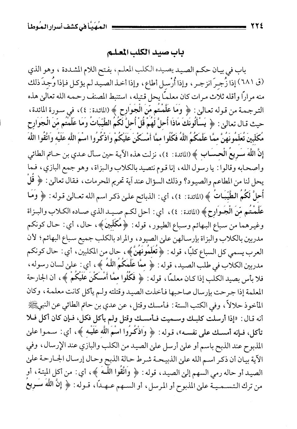 باب في بيان حكم الصيد يصيده الكلب المعلم، بفتح اللام المشددة، وهو الذي (ق 681) إذا زُجِرَ انزجر، وإذا أُرْسِل أطاع، وإذا أخذ الصيد لم يؤكل فإذا وُجِدَ ذلك منه مرارًا وأقله ثلاث مرات كان معلمًا يحل قتيله، استنبط المصنف رحمه الله تعالى هذه الترجمة من قوله تعالى: {وَمَا عَلَّمْتُمْ مِنَ الْجَوَارِحِ} [المائدة: 4]، في سورة المائدة، حيث قال تعالى: {يَسْأَلُونَكَ مَاذَا أُحِلَّ لَهُمْ قُلْ أُحِلَّ لَكُمُ الطَّيِّبَاتُ وَمَا عَلَّمْتُمْ مِنَ الْجَوَارِحِ مُكَلِّبِينَ تُعَلِّمُونَهُنَّ مِمَّا عَلَّمَكُمُ اللَّهُ فَكُلُوا مِمَّا أَمْسَكْنَ عَلَيْكُمْ وَاذْكُرُوا اسْمَ اللَّهِ عَلَيْهِ وَاتَّقُوا اللَّهَ إِنَّ اللَّهَ سَرِيعُ الْحِسَابِ} [المائدة: 4]، نزلت هذه الآية حين سأل عدي بن حاتم الطائي وأصحابه وقالوا: يا رسول الله، إنا قوم نتصيد بالكلاب والبزاة، وهو جمع البازي، فما يحل لنا من المطاعم والصيود؟ وذلك السؤال عند آية تحريم المحرمات، فقال تعالى: {قُلْ أُحِلَّ لَكُمُ الطَّيِّبَاتُ} [المائدة: 4]، أي: الذبائح على ذكر اسم الله تعالى قوله: {وَمَا عَلَّمْتُمْ مِنَ الْجَوَارِحِ} [المائدة: 4]، أي: أحل لكم صيد الذي صاده الكلاب والبزاة وغيرهما من سباع البهائم وسباع الطيور، قوله: {مُكَلِّبِينَ}، حال، أي: حال كونكم مدربين بالكلاب والبزاة بإرسالهن على الصيود، والمراد بالكلب جميع سباع البهائم؛ لأن العرب يسمي كل السباع كلبًا، قوله: {تُعَلِّمُونَهُنَّ}، حال من المكلبين، أي: حال كونكم مدربين الكلاب في طلب الصيد، قوله: {مِمَّا عَلَّمَكُمُ اللَّهُ}، أي: على لسان رسوله، فلا بأس بصيد الكلب إذا كان معلمًا، قوله: {فَكُلُوا مِمَّا أَمْسَكْنَ عَلَيْكُمْ}، أن الجارحة المعلمة إذا جرحت بإرسال صاحبها فأخذت الصيد وقتلته ولم يأكل كانت معلمة، وكان المأخوذ حلالًا، وفي الكتب الستة: فأمسك وقتل، عن عدي بن حاتم الطائي عن النبي - صلى الله عليه وسلم - أنه قال: "إذا أرسلت كلبك وسميت فأمسك وقتل ولم يأكل فكل، فإن كان أكل فلا تأكل، فإنه أمسك على نفسه"، قوله: {وَاذْكُرُوا اسْمَ اللَّهِ عَلَيْهِ}، أي: سموا على المذبوح عند الذبح باسم أو على أرسل على الصيد من الكلب والبازي عند الإِرسال، وفي الآية بيان أن ذكر اسم الله على الذبيحة شرط حالة الذبح وحال إرسال الجارحة على الصيد أو حاله رمي السهم إلى الصيد، قوله: {وَاتَّقُوا اللَّهَ}، أي: من أكل الميتة، أو من ترك التسمية على المذبوح أو المرسل، أو السهم عهدًا، قوله: {إِنَّ اللَّهَ سَرِيعُ