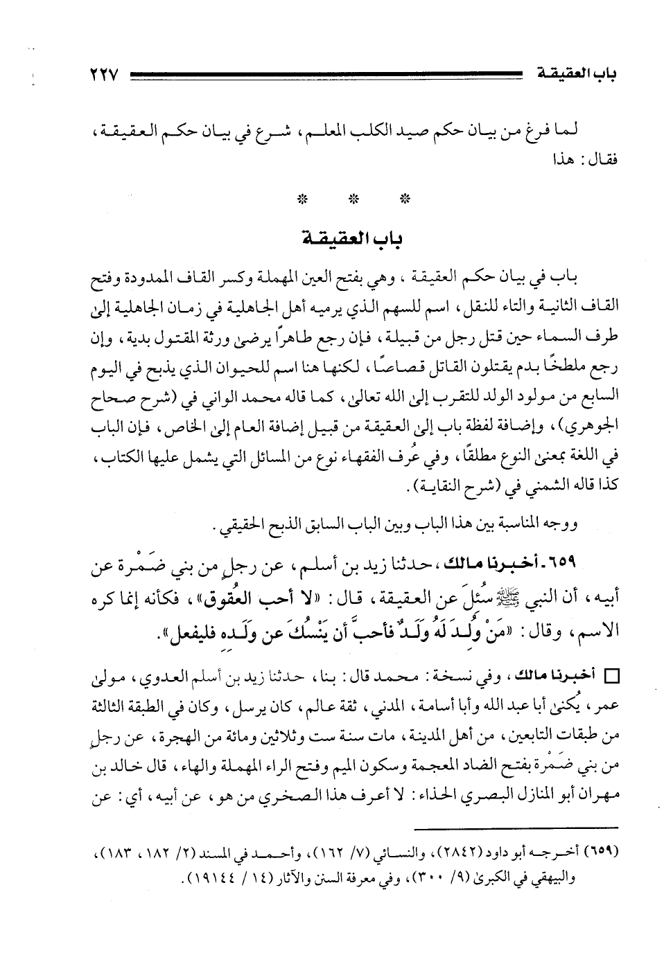 659 - أخبرنا مالك، حدثنا زيد بن أسلم، عن رجل من بني ضَمْرة عن أبيه، أن النبي - صلى الله عليه وسلم - سُئِلَ عن العقيقة، قال: "لا أحب العُقوق"، فكأنه إنما كره الاسم، وقال: "مَنْ وُلِدَ لَهُ وَلَدٌ فأحبَّ أن يَنْسُكَ عن وَلَدِهِ فليفعل".