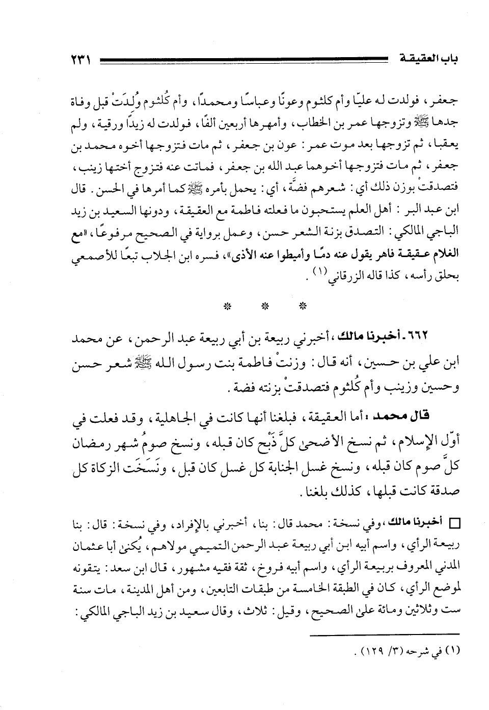 662 - أخبرنا مالك، أخبرني ربيعة بن أبي ربيعة عبد الرحمن، عن محمد بن علي بن حسين، أنه قال: وزنتْ فاطمة بنت رسول الله - صلى الله عليه وسلم - شعر حسن وحسين وزينب وأم كُلثوم فتصدقتْ بزنته فضة.
