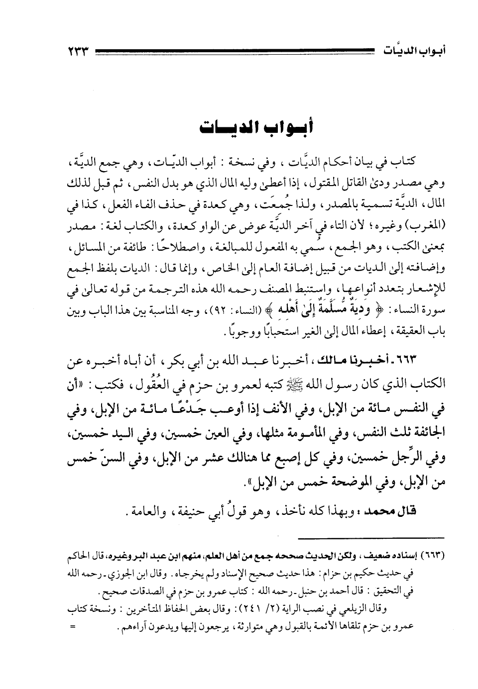 663 - أخبرنا مالك، أخبرنا عبد الله بن أبي بكر، أن أباه أخبره عن الكتاب الذي كان رسول الله - صلى الله عليه وسلم - كتبه لعمرو بن حزم في العُقُول، فكتب: "أن في النفس مائة من الإبل، وفي الأنف إذا أوعب جَدْعًا مائة من الإبل، وفي الجائفة ثلث النفس، وفي المأمومة مثلها، وفي العين خمسين، وفي اليد خمسين، وفي الرِّجل خمسين، وفي كل إصبع مما هنالك عشر من الإبل، وفي السنّ خمس من الإبل، وفي الموضحة خمس من الإبل".