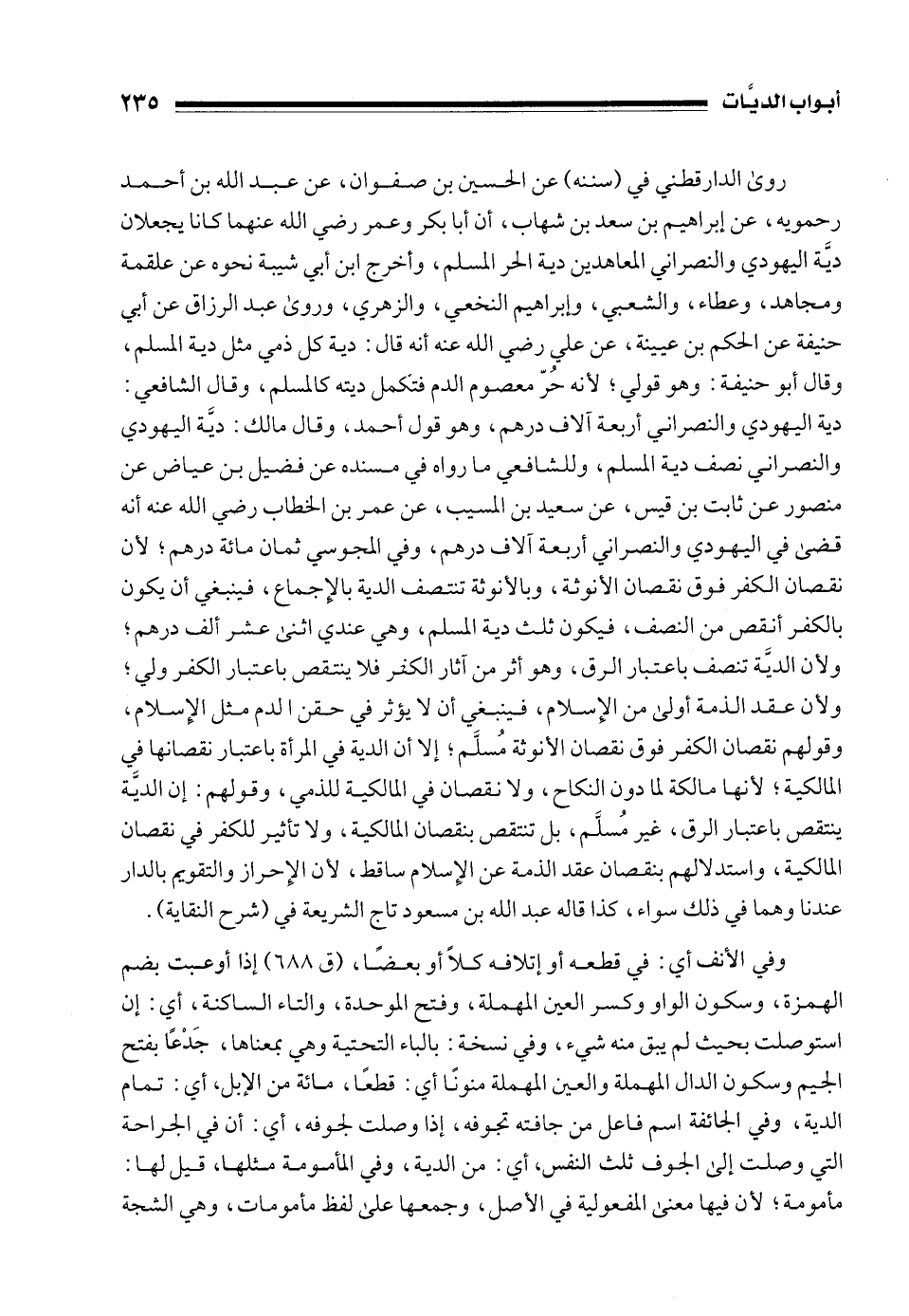 روى الدارقطني في (سننه) عن الحسين بن صفوان، عن عبد الله بن أحمد رحمويه، عن إبراهيم بن سعد بن شهاب، أن أبا بكر وعمر رضي الله عنهما كانا يجعلان ديَّة اليهودي والنصراني المعاهدين دية الحر المسلم، وأخرج ابن أبي شيبة نحوه عن علقمة ومجاهد، وعطاء، والشعبي، وإبراهيم النخعي، والزهري، وروى عبد الرزاق عن أبي حنيفة عن الحكم بن عيينة، عن علي رضي الله عنه أنه قال: دية كل ذمي مثل دية المسلم، وقال أبو حنيفة: وهو قولي؛ لأنه حُرّ معصوم الدم فتكمل ديته كالمسلم، وقال الشافعي: دية اليهودي والنصراني أربعة آلاف درهم، وهو قول أحمد، وقال مالك: ديَّة اليهودي والنصراني نصف دية المسلم، وللشافعي ما رواه في مسنده عن فضيل بن عياض عن منصور عن ثابت بن قيس، عن سعيد بن المسيب، عن عمر بن الخطاب رضي الله عنه أنه قضى في اليهودي والنصراني أربعة آلاف درهم، وفي المجوسي ثمان مائة درهم؛ لأن نقصان الكفر فوق نقصان الأنوثة، وبالأنوثة تنتصف الدية بالإِجماع، فينبغي أن يكون بالكفر أنقص من النصف، فيكون ثلث دية المسلم، وهي عندي اثنى عشر ألف درهم؛ ولأن الديَّة تنصف باعتبار الرق، وهو أثر من آثار الكفر فلا ينتقص باعتبار الكفر ولي؛ ولأن عقد الذمة أولى من الإِسلام، فينبغي أن لا يؤثر في حقن الدم مثل الإِسلام، وقولهم نقصان الكفر فوق نقصان الأنوثة مُسلَّم؛ إلا أن الدية في المرأة باعتبار نقصانها في المالكية؛ لأنها مالكة لما دون النكاح، ولا نقصان في المالكية للذمي، وقولهم: إن الديَّة ينتقص باعتبار الرق، غير مُسلَّم، بل تنتقص بنقصان المالكية، ولا تأثير للكفر في نقصان المالكية، واستدلالهم بنقصان عقد الذمة عن الإِسلام ساقط، لأن الإِحراز والتقويم بالدار عندنا وهما في ذلك سواء، كذا قاله عبد الله بن مسعود تاج الشريعة في (شرح النقاية).