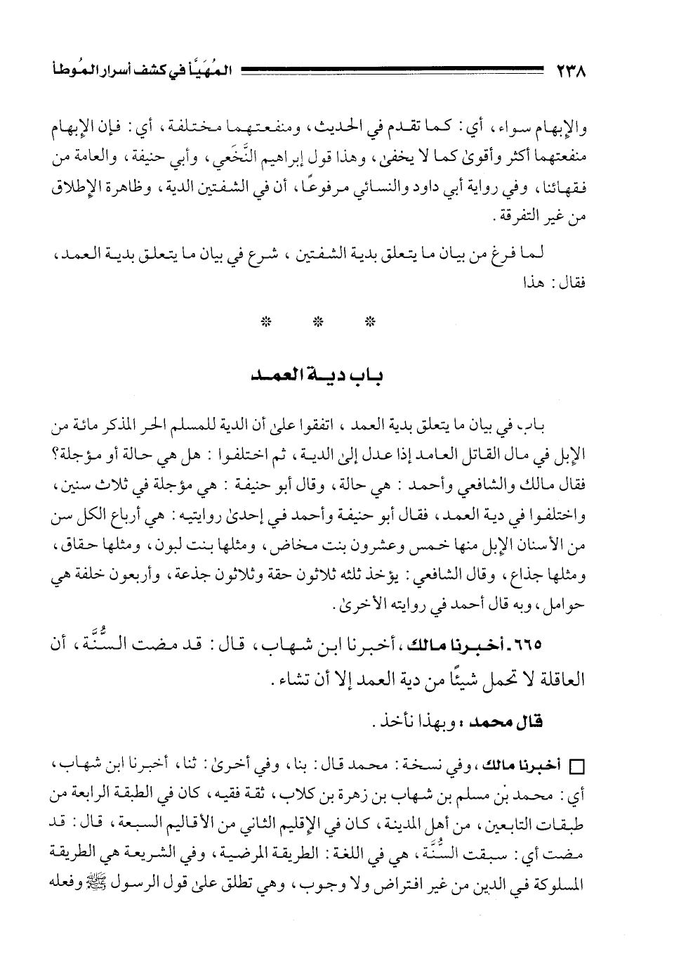 665 - أخبرنا مالك، أخبرنا ابن شهاب، قال: قد مضت السُّنَّة، أن العاقلة لا تحمل شيئًا من دية العمد إلا أن تشاء.