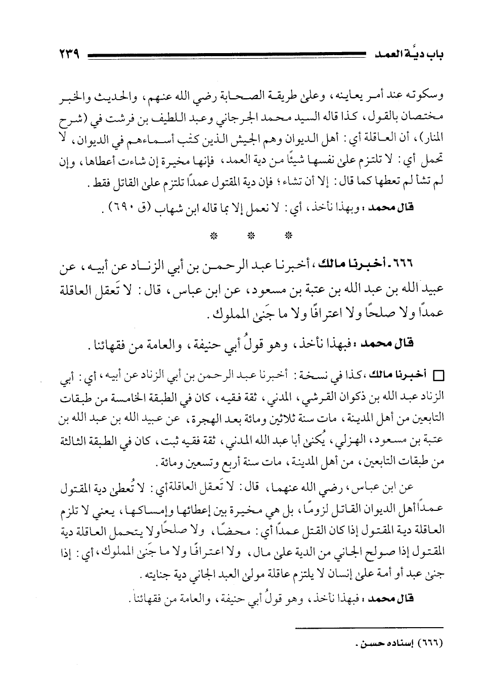 666 - أخبرنا مالك، أخبرنا عبد الرحمن بن أبي الزناد عن أبيه، عن عبيد الله بن عبد الله بن عتبة بن مسعود، عن ابن عباس، قال: لا تَعقل العاقلة عمدًا ولا صلحًا ولا اعترافًا ولا ما جَنى المملوك.