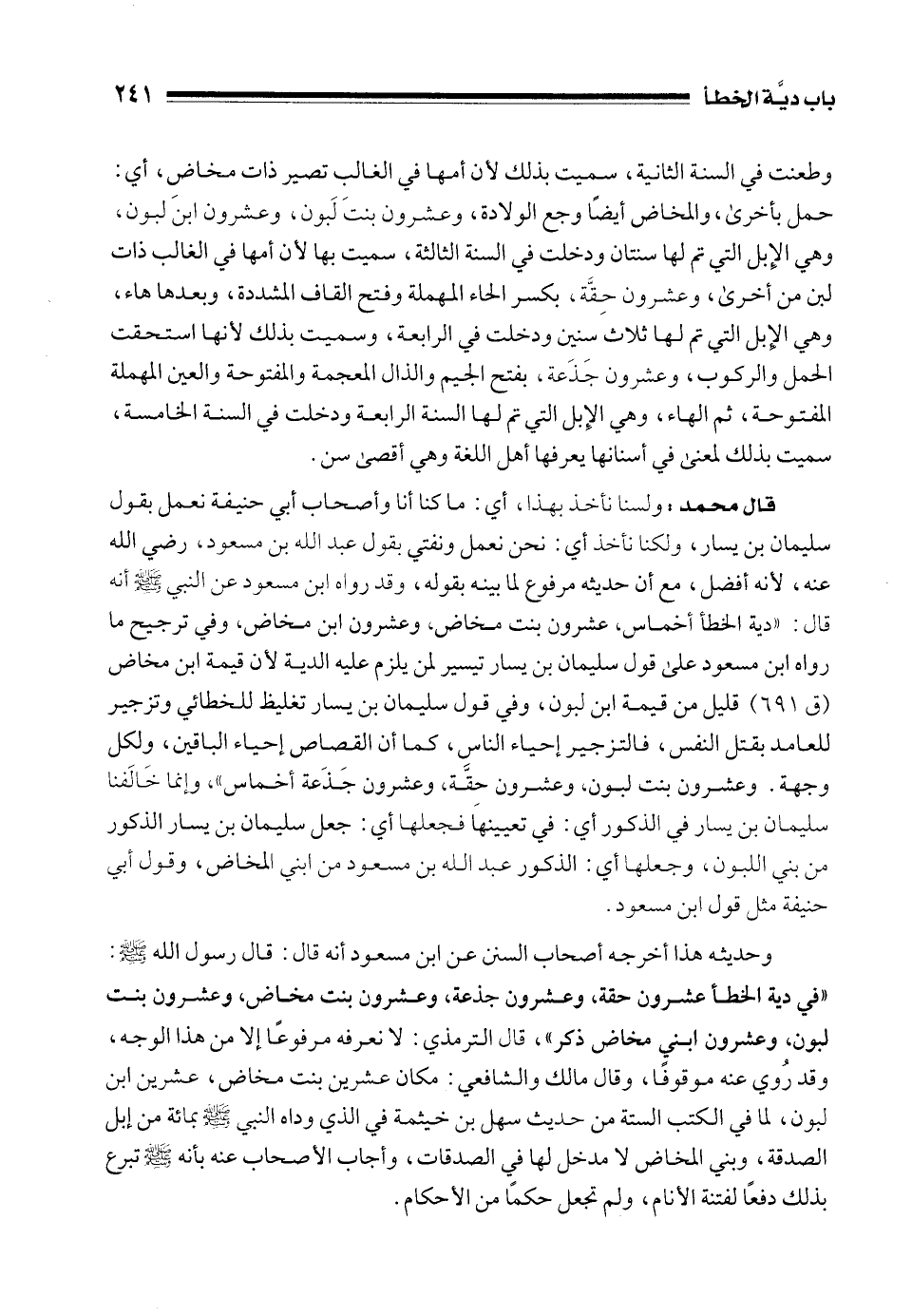 وحديثه هذا أخرجه أصحاب السنن عن ابن مسعود أنه قال: قال رسول الله - صلى الله عليه وسلم -: "في دية الخطأ عشرون حقة، وعشرون جذعة، وعشرون بنت مخاض، وعشرون بنت لبون، وعشرون ابني مخاض ذكر"، قال الترمذي: لا نعرفه مرفوعًا إلا من هذا الوجه، وقد رُوي عنه موقوفًا، وقال مالك والشافعي: مكان عشرين بنت مخاض، عشرين ابن لبون، لما في الكتب الستة من حديث سهل بن خيثمة في الذي وداه النبي - صلى الله عليه وسلم - بمائة من إبل الصدقة، وبني المخاض لا مدخل لها في الصدقات، وأجاب الأصحاب عنه بأنه - صلى الله عليه وسلم - تبرع بذلك دفعًا لفتنة الأنام، ولم تجعل حكمًا من الأحكام.