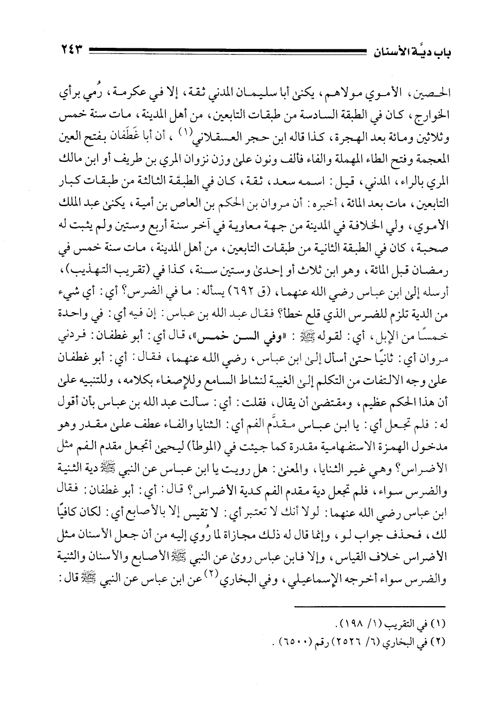الحصين، الأموي مولاهم، يكنى أبا سليمان المدني ثقة، إلا في عكرمة، رُمي برأي الخوارج، كان في الطبقة السادسة من طبقات التابعين، من أهل المدينة، مات سنة خمس وثلاثين ومائة بعد الهجرة، كذا قاله ابن حجر العسقلاني (¬1)، أن أبا غَطَفان بفتح العين المعجمة وفتح الطاء المهملة والفاء فألف ونون على وزن نزوان المري بن طريف أو ابن مالك المري بالراء، المدني، قيل: اسمه سعد، ثقة، كان في الطبقة الثالثة من طبقات كبار التابعين، مات بعد المائة، أخبره: أن مروان بن الحكم بن العاص بن أمية، يكنى عبد الملك الأموي، ولي الخلافة في المدينة من جهة معاوية في آخر سنة أربع وستين ولم يثبت له صحبة، كان في الطبقة الثانية من طبقات التابعين، من أهل المدينة، مات سنة خمس في رمضان قبل المائة، وهو ابن ثلاث أو إحدى وستين سنة، كذا في (تقريب التهذيب)، أرسله إلى ابن عباس رضي الله عنهما، (ق 692) يسأله: ما في الضرس؟ أي: أي شيء من الدية تلزم للضرس الذي قلع خطأ؟ فقال عبد الله بن عباس: إن فيه أي: في واحدة خمسًا من الإِبل، أي: لقوله - صلى الله عليه وسلم -: "وفي السن خمس"، قال أي: أبو غطفان: فردني مروان أي: ثانيًا حتى أسأل إلى أبن عباس، رضي الله عنهما، فقال: أي: أبو غطفان على وجه الالتفات من التكلم إلى الغيبة لنشاط السامع وللإِصغاء بكلامه، وللتنبيه على أن هذا الحكم عظيم، ومقتضى أن يقال، فقلت: أي: سألت عبد الله بن عباس بأن أقول له: فلم تجعل أي: يا ابن عباس مقدَّم الفم أي: الثنايا والفاء عطف على مقدر وهو مدخول الهمزة الاستفهامية مقدرة كما جيئت في (الموطأ) ليحيى أتجعل مقدم الفم مثل الأضراس؟ وهي غير الثنايا، والمعنى: هل رويت يا ابن عباس عن النبي - صلى الله عليه وسلم - دية الثنية والضرس سواء، فلم تجعل دية مقدم الفم كدية الأضراس؟ قال: أي: أبو غطفان: فقال ابن عباس رضي الله عنهما: لولا أنك لا تعتبر أي: لا تقيس إلا بالأصابع أي: لكان كافيًا لك، فحذف جواب لو، وإنما قال له ذلك مجازاة لما رُوي إليه من أن جعل الأسنان مثل الأضراس خلاف القياس، وإلا فابن عباس روى عن النبي - صلى الله عليه وسلم - الأصابع والأسنان والثنية والضرس سواء أخرجه الإسماعيلي، وفي البخاري (¬2) عن ابن عباس عن النبي - صلى الله عليه وسلم - قال: