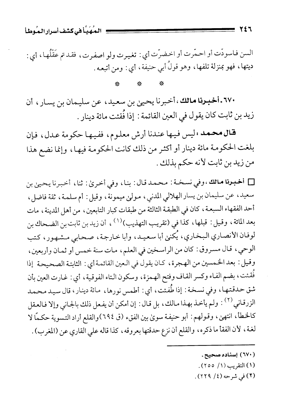 • أخبرنا مالك، وفي نسخة: محمد قال: بنا، وفي أخرى: ثنا، أخبرنا يحيى بن سعيد، عن سليمان بن يسار الهلالي المدني، مولى ميمونة، وقيل: أم سلمة، ثقة فاضل، أحد الفقهاء السبعة، كان في الطبقة الثالثة من طبقات كبار التابعين، من أهل المدينة، مات بعد المائة، وقيل: قبلها، كذا في (تقريب التهذيب) (¬1)، أن زيد بن ثابت بن الضحاك بن لوفان الأنصاري البخاري، يُكنى أبا سعيد، وأبا خارجة، صحابي مشهور، كتب الوحي، قال مسروق: كان من الراسخين في العلم، مات سنة خمس أو ثمان وأربعين، وقيل: بعد الخمسين من الهجرة، كان يقول في العين القائمة أي: الثابتة الصحيحة إذا فُقئت، بضم الفاء وكسر القاف وفتح الهمزة، وسكون التاء الفوقية، أي: غارت العين بأن شق حدقتها، وفي نسخة: إذا طُفئت، أي: أطمس نورها، مائة دينار، قال سيد محمد الزرقاني (¬2): ولم يأخذ بهذا مالك، بل قال: إن أمكن أن يفعل ذلك بالجاني وإلا فالعقل كالخطأ، انتهى، وقولهم: أبو حنيفة سوى بين الفقء (ق 694) والقلع أراد التسوية حكمًا لا لغة، لأن الفقأ ما ذكره، والقلع أن نزع حدقتها بعروقه، كذا قاله علي القاري عن (المغرب).