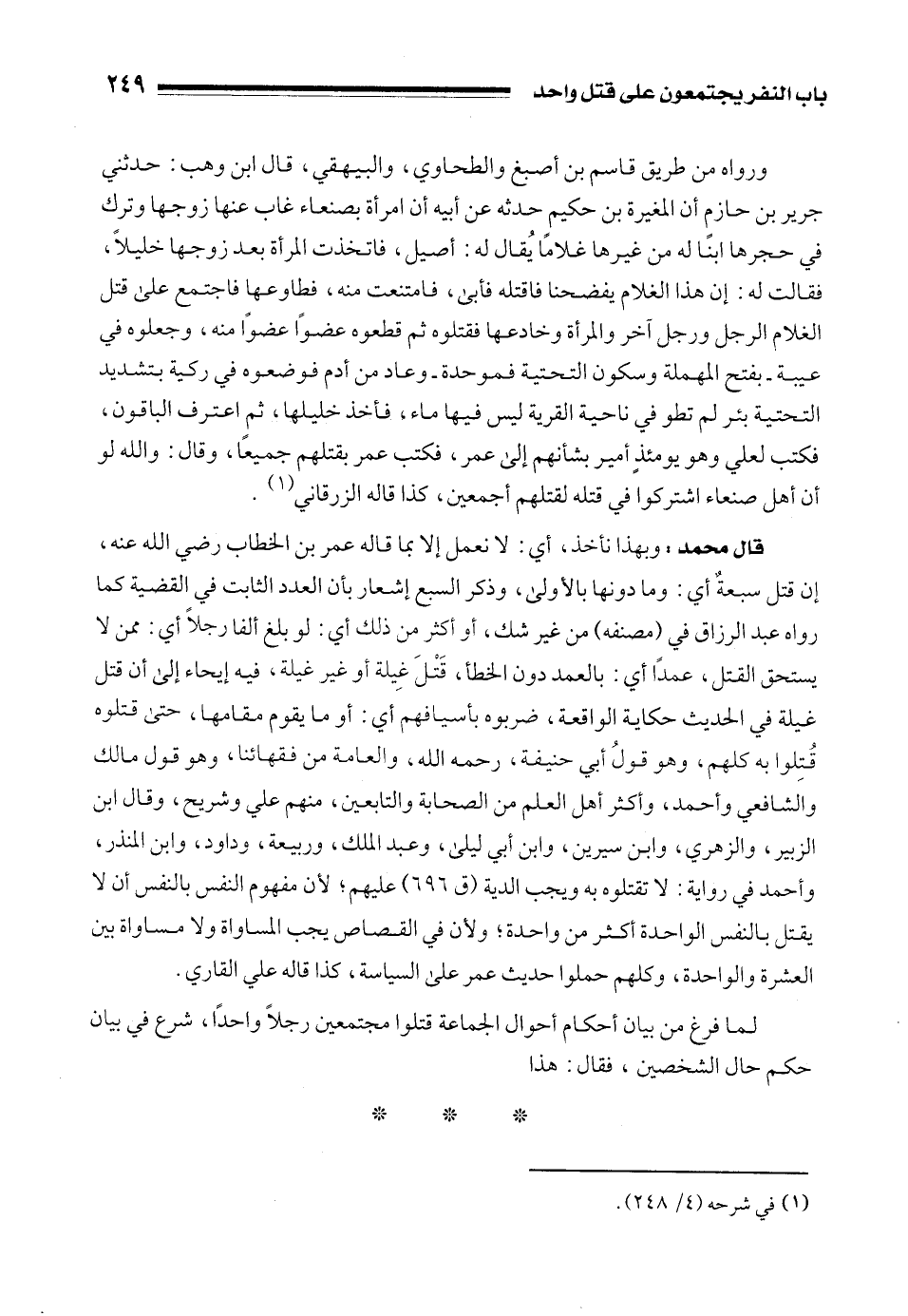 قال محمد: وبهذا نأخذ، أي: لا نعمل إلا بما قاله عمر بن الخطاب رضي الله عنه، إن قتل سبعةٌ أي: وما دونها بالأولى، وذكر السبع إشعار بأن العدد الثابت في القضية كما رواه عبد الرزاق في (مصنفه) من غير شك، أو أكثر من ذلك أي: لو بلغ ألفا رجلًا أي: ممن لا يستحق القتل، عمدًا أي: بالعمد دون الخطأ، قَتْلَ غِيلة أو غير غيلة، فيه إيحاء إلى أن قتل غيلة في الحديث حكاية الواقعة، ضربوه بأسيافهم أي: أو ما يقوم مقامها، حتى قتلوه قُتِلوا به كلهم، وهو قولُ أبي حنيفة، رحمه الله، والعامة من فقهائنا، وهو قول مالك والشافعي وأحمد، وأكثر أهل العلم من الصحابة والتابعين، منهم علي وشريح، وقال ابن الزبير، والزهري، وابن سيرين، وابن أبي ليلى، وعبد الملك، وربيعة، وداود، وابن المنذر، وأحمد في رواية: لا تقتلوه به ويجب الدية (ق 696) عليهم؛ لأن مفهوم النفس بالنفس أن لا يقتل بالنفس الواحدة أكثر من واحدة؛ ولأن في القصاص يجب المساواة ولا مساواة بين العشرة والواحدة، وكلهم حملوا حديث عمر على السياسة، كذا قاله علي القاري.
