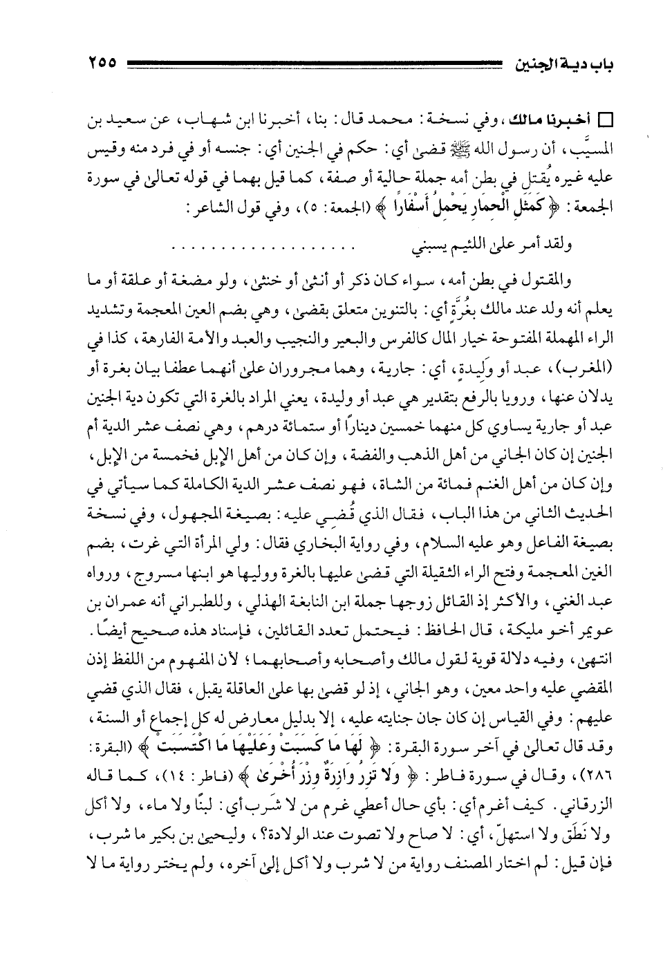 • أخبرنا مالك، وفي نسخة: محمد قال: بنا، أخبرنا ابن شهاب، عن سعيد بن المسيَّب، أن رسول الله - صلى الله عليه وسلم - قضى أي: حكم في الجنين أي: جنسه أو في فرد منه وقيس عليه غيره يُقتل في بطن أمه جملة حالية أو صفة، كما قيل بهما في قوله تعالى في سورة الجمعة: {كَمَثَلِ الْحِمَارِ يَحْمِلُ أَسْفَارًا} [الجمعة: 5]، وفي قول الشاعر: