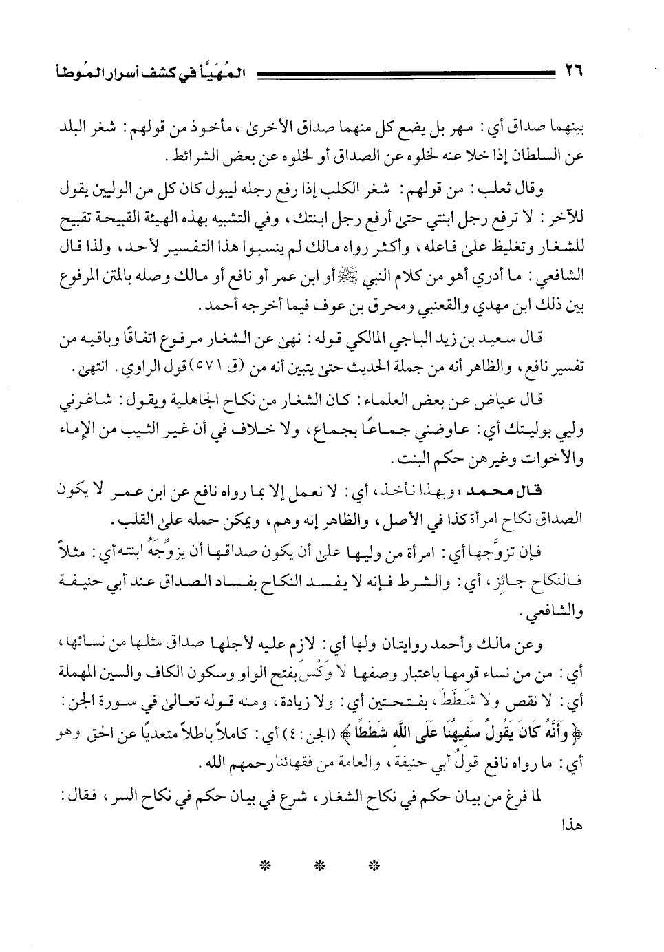 وقال ثعلب: من قولهم: شغر الكلب إذا رفع رجله ليبول كان كل من الوليين يقول للآخر: لا ترفع رجل ابنتي حتى أرفع رجل ابنتك، وفي التشبيه بهذه الهيئة القبيحة تقبيح للشغار وتغليظ على فاعله، وأكثر رواه مالك لم ينسبوا هذا التفسير لأحد، ولذا قال الشافعي: ما أدري أهو من كلام النبي - صلى الله عليه وسلم - أو ابن عمر أو نافع أو مالك وصله بالمتن المرفوع بين ذلك ابن مهدي والقعنبي ومحرق بن عوف فيما أخرجه أحمد.