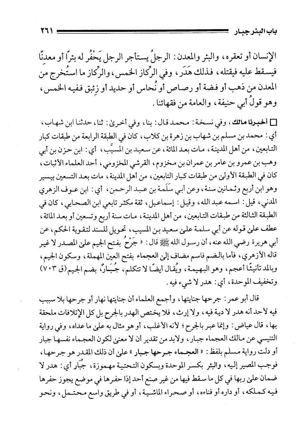 • أخبرنا مالك، وفي نسخة: محمد قال: بنا، وفي أخرى: ثنا، حدثنا ابن شهاب, أي: محمد بن مسلم بن شهاب بن زهرة بن كلاب، كان في الطبقة الرابعة من طبقات كبار التابعين، من أهل المدينة، مات بعد المائة، عن سعيد بن المسيَّب، أي: ابن حزن بن أبي وهب بن عمرو بن عامر بن عمران بن مخزوم، القرشي المخزومي، أحد العلماء الأثبات، كان في الطبقة الأولى من طبقات كبار التابعين، من أهل المدينة، مات بعد التسعين بيسير وهو ابن أربع وثمانين سنة، وعن أبي سَلَمة بن عبد الرحمن، أي: ابن عوف الزهري المدني، قيل: اسمه عبد الله، وقيل: إسماعيل، ثقة مكثر تابعي ابن الصحابي، كان في الطبقة الثالثة من طبقات التابعين، من أهل المدينة، مات سنة أربع وتسعين أو بعد المائة، عطف على قوله عن أبي سلمة على سعيد بن المسيب، تحويل للسند لتقوية الحكم، عن أبي هريرة رضي الله عنه، أن رسول الله - صلى الله عليه وسلم - قال: "جَرْحُ بفتح الجيم على المصدر لا غير قاله الأزهري، فأما بالضم فاسم مضاف إلى العجماء بفتح العين المهملة، وسكون الجيم، وبالمد تأنيثًا أعجم، وهو البهيمة، ويُقال أيضًا لا تتكلم، جُبَارٌ, بضم الجيم (ق 703) وتخفيف الموحدة، أي: هدر لا شيء فيه.
