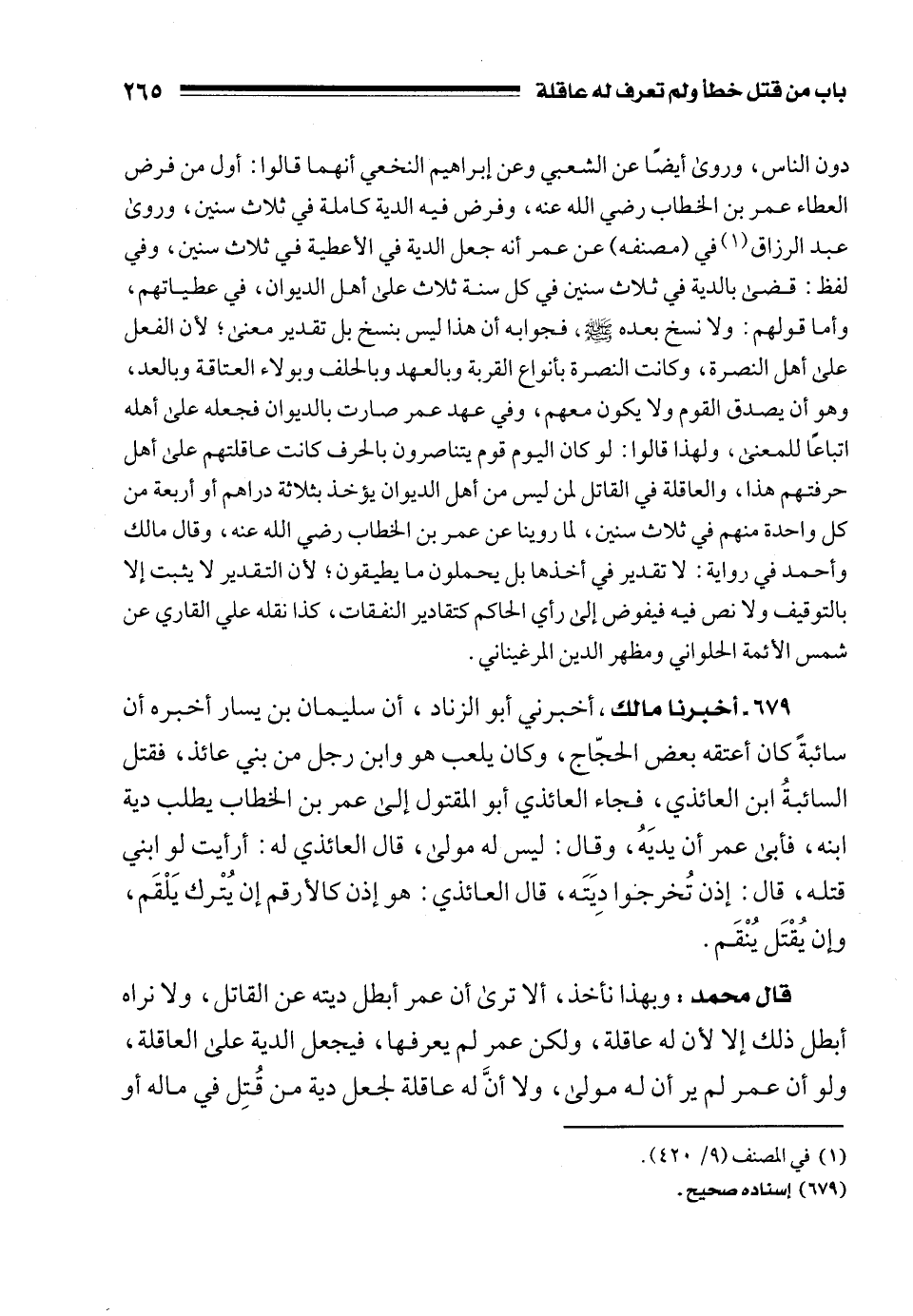 679 - أخبرنا مالك، أخبرني أبو الزناد، أن سليمان بن يسار أخبره أن سائبةً كان أعتقه بعض الحجّاج، وكان يلعب هو وابن رجل من بني عائذ، فقتل السائبةُ ابن العائذي، فجاء العائذي أبو المقتول إلى عمر بن الخطاب يطلب دية ابنه، فأبى عمر أن يديَهُ، وقال: ليس له مولى، قال العائذي له: أرأيت لو ابني قتله، قال: إذن تُخرجوا دِيَتَه، قال العائذي: هو إذن كالأرقم إن يُتْرك يَلْقَم، وإن يُقْتَل يُنْقَم.
