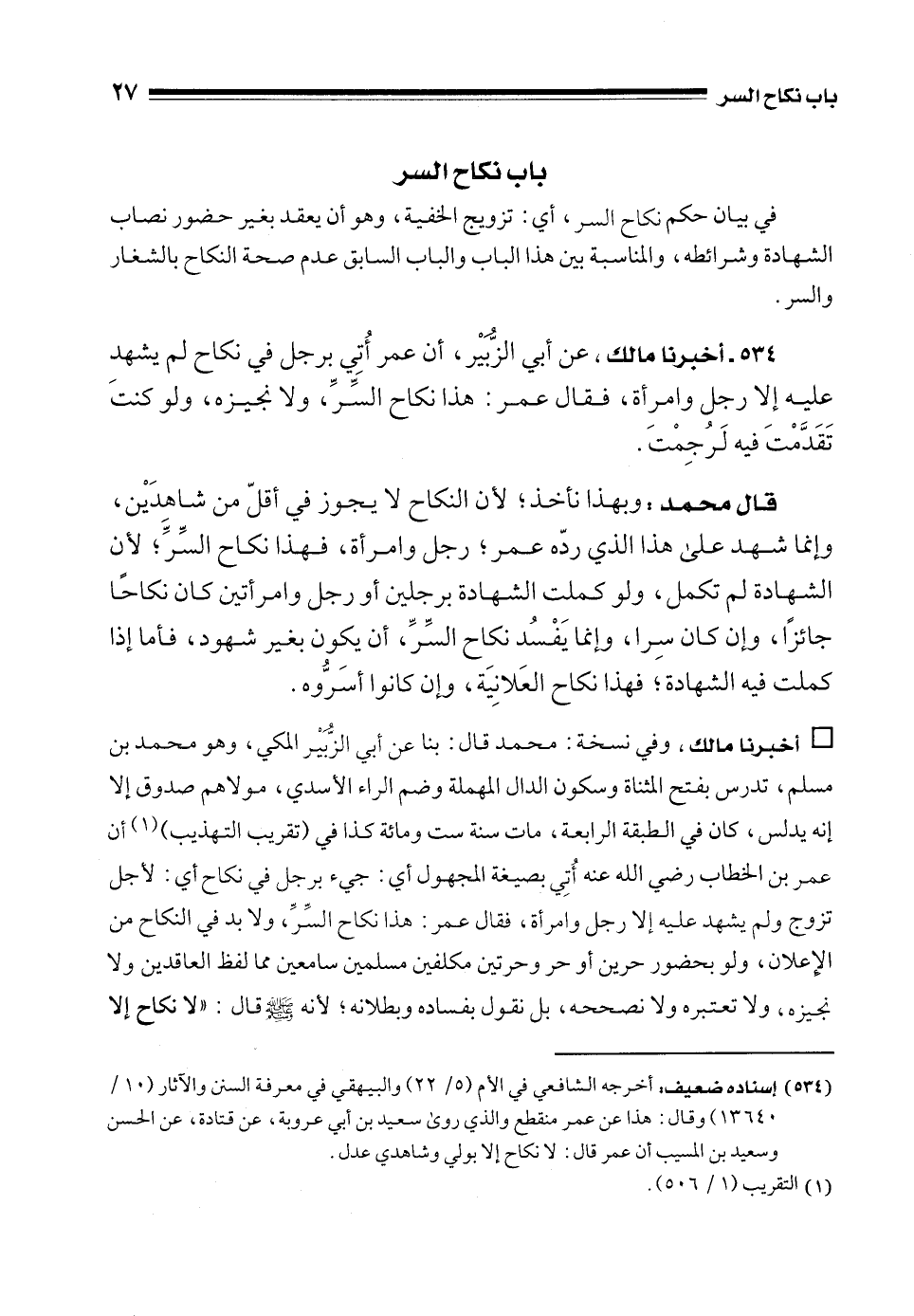 534 - أخبرنا مالك, عن أبي الزُّبَيْر، أن عمر أُتي برجل في نكاح لم يشهد عليه إلا رجل وامرأة، فقال عمر: هذا نكاح السِّرِّ، ولا نجيزه، ولو كنتَ تَقَدَّمْتَ فيه لَرُجِمْتَ.