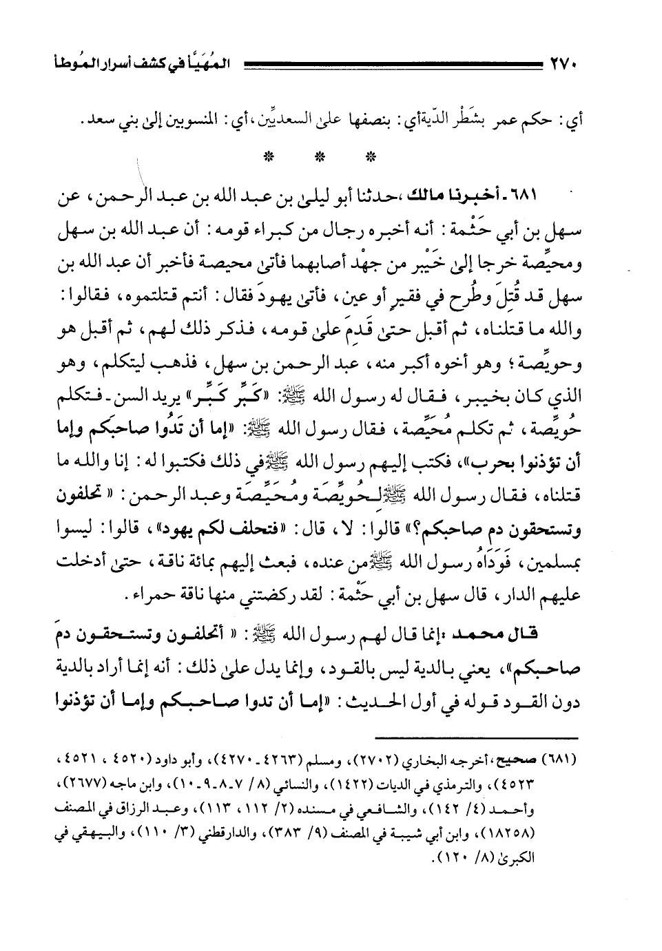 681 - أخبرنا مالك، حدثنا أبو ليلى بن عبد الله بن عبد الرحمن، عن سهل بن أبي حَثْمة: أنه أخبره رجال من كبراء قومه: أن عبد الله بن سهل ومحيِّصة خرجا إلى خَيْبر من جهْد أصابهما فأتى محيصة فأخبر أن عبد الله بن سهل قد قُتِلَ وطُرح في فقيرٍ أو عين، فأتى يهودَ فقال: أنتم قتلتموه، فقالوا: والله ما قتلناه، ثم أقبل حتى قَدِمَ على قومه، فذكر ذلك لهم، ثم أقبل هو وحويِّصة؛ وهو أخوه أكبر منه، عبد الرحمن بن سهل، فذهب ليتكلم، وهو الذي كان بخيبر، فقال له رسول الله - صلى الله عليه وسلم -: "كَبِّر كبِّر" يريد السن - فتكلم حُويِّصة، ثم تكلم مُحَيِّصة، فقال رسول الله - صلى الله عليه وسلم -: "إما أن تَدُوا صاحبَكم وإما أن تؤذنوا بحرب"، فكتب إليهم رسول الله - صلى الله عليه وسلم - ذلك فكتبوا له: إنا والله ما قتلناه، فقال رسول الله - صلى الله عليه وسلم - لِحُويِّصَة ومُحَيِّصَة وعبد الرحمن: "تحلفون وتستحقون دم صاحبكم؟ " قالوا: لا، قال: "فتحلف لكم يهود"، قالوا: ليسوا بمسلمين، فَوَدَاهُ رسول الله - صلى الله عليه وسلم - من عنده، فبعث إليهم بمائة ناقة، حتى أدخلت عليهم الدار، قال سهل بن أبي حَثْمة: لقد ركضتني منها ناقة حمراء.