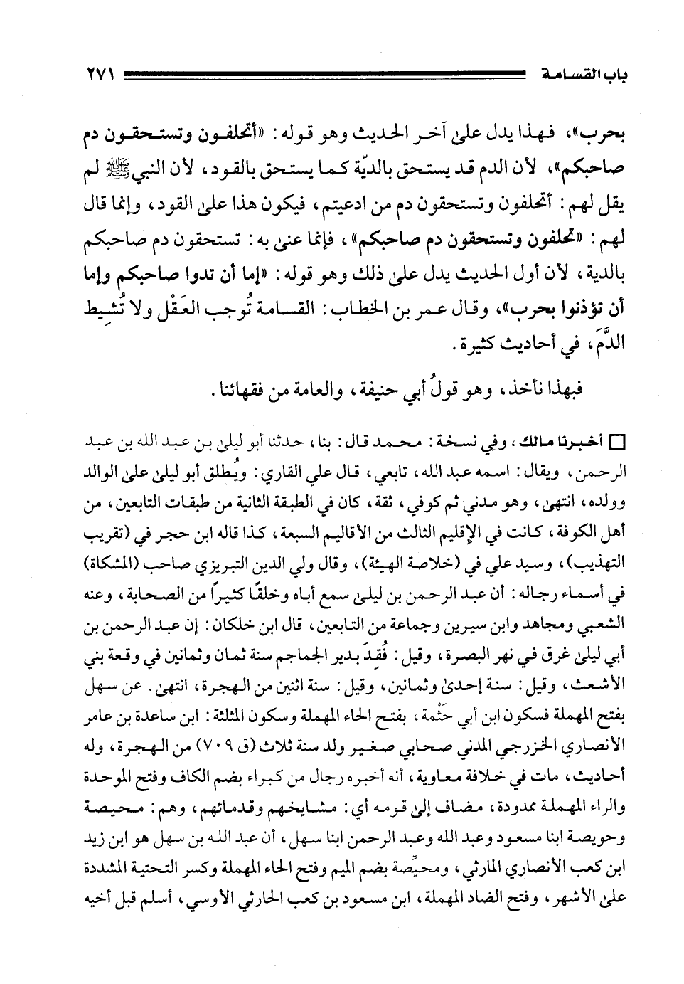 • أخبرنا مالك، وفي نسخة: محمد قال: بنا، حدثنا أبو ليلى بن عبد الله بن عبد الرحمن، ويقال: اسمه عبد الله، تابعي، قال علي القاري: ويُطلق أبو ليلى على الوالد وولده، انتهى، وهو مدني ثم كوفي، ثقة، كان في الطبقة الثانية من طبقات التابعين، من أهل الكوفة، كانت في الإِقليم الثالث من الأقاليم السبعة، كذا قاله ابن حجر في (تقريب التهذيب)، وسيد علي في (خلاصة الهيئة)، وقال ولي الدين التبريزي صاحب (المشكاة) في أسماء رجاله: أن عبد الرحمن بن ليلى سمع أباه وخلقًا كثيرًا من الصحابة، وعنه الشعبي ومجاهد وابن سيرين وجماعة من التابعين، قال ابن خلكان: إن عبد الرحمن بن أبي ليلى غرق في نهر البصرة، وقيل: فُقِدَ بدير الجماجم سنة ثمان وثمانين في وقعة بني الأشعث، وقيل: سنة إحدى وثمانين، وقيل: سنة اثنين من الهجرة، انتهى. عن سهل بفتح المهملة فسكون ابن أبي حَثْمة، بفتح الحاء المهملة وسكون المثلثة: ابن ساعدة بن عامر الأنصاري الخزرجي المدني صحابي صغير ولد سنة ثلاث (ق 709) من الهجرة، وله أحاديث، مات في خلافة معاوية، أنه أخبره رجال من كبراء بضم الكاف وفتح الموحدة والراء المهملة ممدودة، مضاف إلى قومه أي: مشايخهم وقدمائهم، وهم: محيصة وحويصة ابنا مسعود وعبد الله وعبد الرحمن ابنا سهل، أن عبد الله بن سهل هو ابن زيد بن كعب الأنصاري المارثي، ومحيِّصة بضم الميم وفتح الحاء المهملة وكسر التحتية المشددة على الأشهر، وفتح الضاد المهملة، ابن مسعود بن كعب الحارثي الأوسي، أسلم قبل أخيه