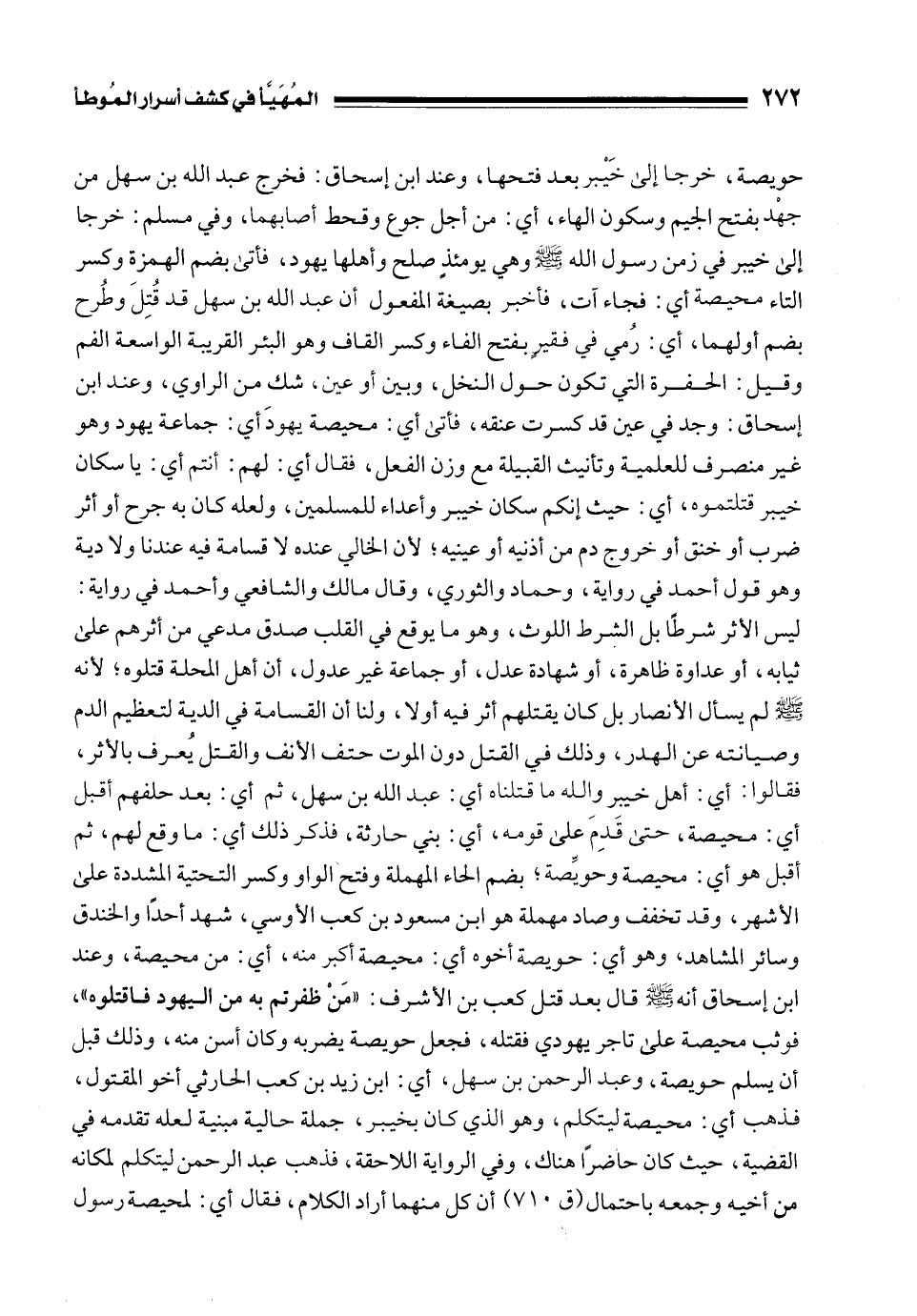 حويصة، خرجا إلى خَيْبر بعد فتحها، وعند ابن إسحاق: فخرج عبد الله بن سهل من جهْد بفتح الجيم وسكون الهاء، أي: من أجل جوع وقحط أصابهما، وفي مسلم: خرجا إلى خيبر في زمن رسول الله - صلى الله عليه وسلم - وهي يومئذٍ صلح وأهلها يهود، فأتى بضم الهمزة وكسر التاء محيصة أي: فجاء آت، فأخبر بصيغة المفعول أن عبد الله بن سهل قد قُتِلَ وطُرح بضم أولهما، أي: رُمي في فقير بفتح الفاء وكسر القاف وهو البئر القريبة الواسعة الفم وقيل: الحفرة التي تكون حول النخل، وبين أو عين، شك من الراوي، وعند ابن إسحاق: وجد في عين قد كسرت عنقه، فأتى أي: محيصة يهودَ أي: جماعة يهود وهو غير منصرف للعلمية وتأنيث القبيلة مع وزن الفعل، فقال أي: لهم: أنتم أي: يا سكان خيبر قتلتموه، أي: حيث إنكم سكان خيبر وأعداء للمسلمين، ولعله كان به جرح أو أثر ضرب أو خنق أو خروج دم من أذنيه أو عينيه؛ لأن الخالي عنده لا قسامة فيه عندنا ولا دية وهو قول أحمد في رواية، وحماد والثوري، وقال مالك والشافعي وأحمد في رواية: ليس الأثر شرطًا بل الشرط اللوث، وهو ما يوقع في القلب صدق مدعي من أثرهم على ثيابه، أو عداوة ظاهرة، أو شهادة عدل، أو جماعة غير عدول، أن أهل المحلة قتلوه؛ لأنه - صلى الله عليه وسلم - لم يسأل الأنصار بل كان يقتلهم أثر فيه أولا، ولنا أن القسامة في الدية لتعظيم الدم وصيانته عن الهدر، وذلك في القتل دون الموت حتف الأنف والقتل يُعرف بالأثر، فقالوا: أي: أهل خيبر والله ما قتلناه أي: عبد الله بن سهل، ثم أي: بعد حلفهم أقبل أي: محيصة، حتى قَدِمَ على قومه، أي: بني حارثة، فذكر ذلك أي: ما وقع لهم، ثم أقبل هو أي: محيصة وحويِّصة؛ بضم الحاء المهملة وفتح الواو وكسر التحتية المشددة على الأشهر، وقد تخفف وصاد مهملة هو ابن مسعود بن كعب الأوسي، شهد أحدًا والخندق وسائر المشاهد، وهو أي: حويصة أخوه أي: محيصة أكبر منه، أي: من محيصة، وعند ابن إسحاق أنه - صلى الله عليه وسلم - قال بعد قتل كعب بن الأشرف: "مَنْ ظفرتم به من اليهود فاقتلوه"، فوثب محيصة على تاجر يهودي فقتله، فجعل حويصة يضربه وكان أسن منه، وذلك قبل أن يسلم حويصة، وعبد الرحمن بن سهل، أي: ابن زيد بن كعب الحارثي أخو المقتول، فذهب أي: محيصة ليتكلم، وهو الذي كان بخيبر، جملة حالية مبنية لعله تقدمه في القضية، حيث كان حاضرًا هناك، وفي الرواية اللاحقة، فذهب عبد الرحمن ليتكلم لمكانه من أخيه وجمعه باحتمال (ق 710) أن كل منهما أراد الكلام، فقال أي: لمحيصة رسول