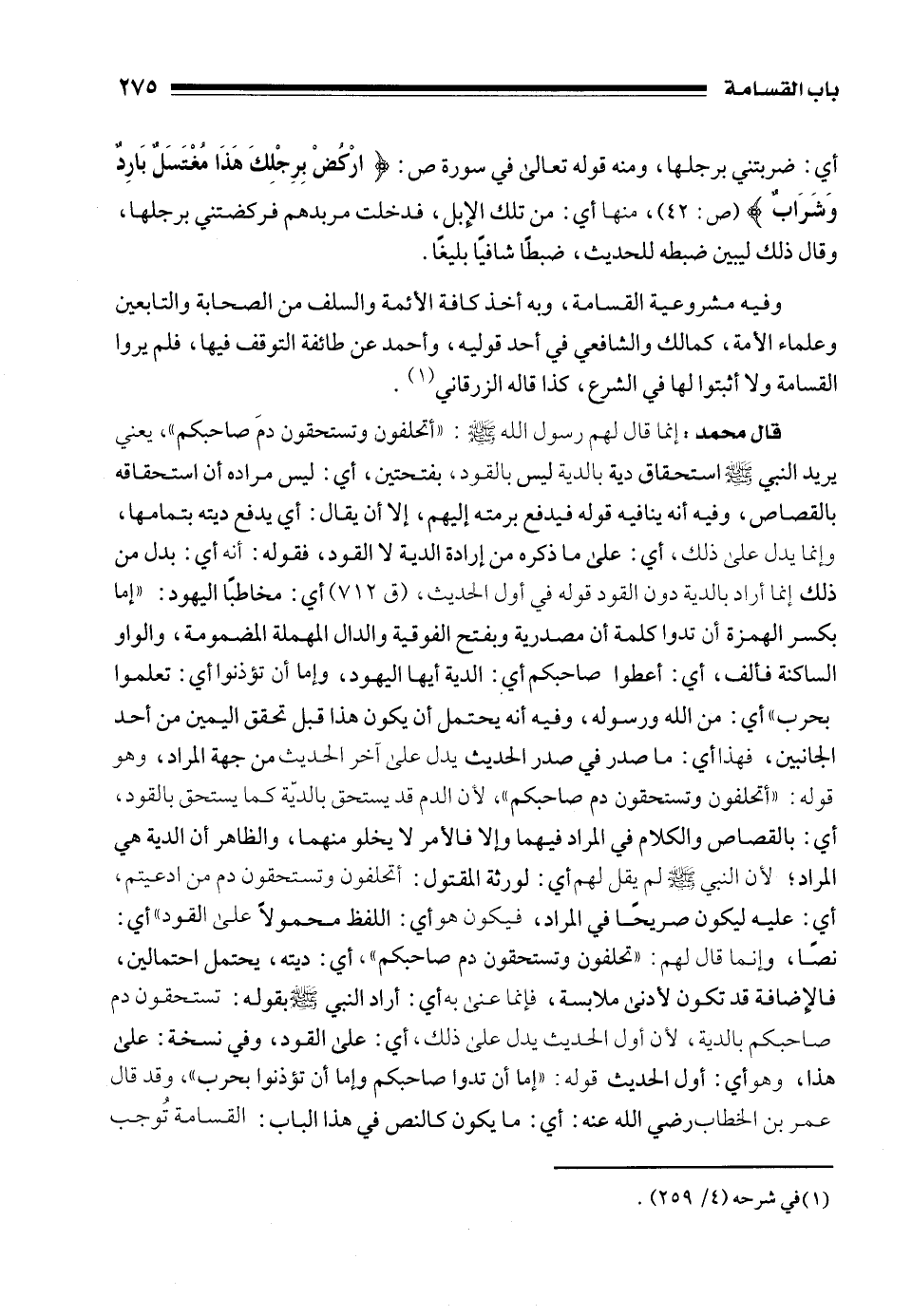 قال محمد: إنما قال لهم رسول الله - صلى الله عليه وسلم -: "أتحلفون وتستحقون دمَ صاحبكم"، يعني يريد النبي - صلى الله عليه وسلم - استحقاق دية بالدية ليس بالقود، بفتحتين، أي: ليس مراده أن استحقاقه بالقصاص، وفيه أنه ينافيه قوله فيدفع برمته إليهم، إلا أن يقال: أي يدفع ديته بتمامها، وإنما يدل على ذلك، أي: على ما ذكره من إرادة الدية لا القود، فقوله: أنه أي: بدل من ذلك إنما أراد بالدية دون القود قوله في أول الحديث، (ق 712) أي: مخاطبًا اليهود: "إما بكسر الهمزة أن تدوا كلمة أن مصدرية وبفتح الفوقية والدال المهملة المضمومة، والواو الساكنة فألف، أي: أعطوا صاحبكم أي: الدية أيها اليهود، وإما أن تؤذنوا أي: تعلموا بحرب" أي: من الله ورسوله، وفيه أنه يحتمل أن يكون هذا قبل تحقق اليمين من أحد الجانبين، فهذا أي: ما صدر في صدر الحديث يدل على آخر الحديث من جهة المراد، وهو قوله: "أتحلفون وتستحقون دم صاحبكم"، لأن الدم قد يستحق بالدية كما يستحق بالقود، أي: بالقصاص والكلام في المراد فيهما وإلا فالأمر لا يخلو منهما، والظاهر أن الدية هي المراد؛ لأن النبي - صلى الله عليه وسلم - لم يقل لهم أي: لورثة المقتول: أتحلفون وتستحقون دم من ادعيتم، أي: عليه ليكون صريحًا في المراد، فيكون هو أي: اللفظ محمولًا على القود" أي: نصًا، وإنما قال لهم: "تحلفون وتستحقون دم صاحبكم"، أي: ديته، يحتمل احتمالين، فالإِضافة قد تكون لأدنى ملابسة، فإنما عنى به أي: أراد النبي - صلى الله عليه وسلم - بقوله: تستحقون دم صاحبكم بالدية، لأن أول الحديث يدل على ذلك، أي: على القود، وفي نسخة: على هذا، وهو أي: أول الحديث قوله: "إما أن تدوا صاحبكم وإما أن تؤذنوا بحرب"، وقد قال عمر بن الخطاب رضي الله عنه: أي: ما يكون كالنص في هذا الباب: القسامة تُوجب