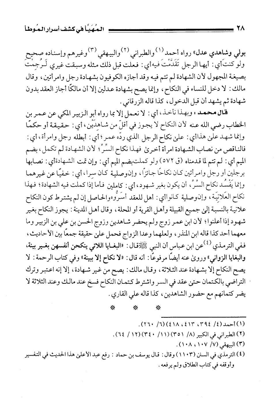 قال محمد: وبهذا نأخذ، أي: لا نعمل إلا بما رواه أبو الزبير المكي عن عمر بن الخطاب رضي الله عنه لأن النكاح لا يجوز في أقلّ من شاهِدَيْن، أي: حقيقة أو حكمًا وإنما شهد على هذا أي: على نكاح الرجل الذي ردّه عمر؛ أي: أبطله رجل وامرأة، أي: فالناقص من نصاب الشهادة امرأة أخرى فهذا نكاح السِّرِّ؛ لأن الشهادة لم تكمل، بضم الميم أي: لم تتم لما قدمناه (ق 572) ولو كملت بضم الميم أي: وإن تمت الشهادة أي: نصابها برجلين أو رجل وامرأتين كان نكاحًا جائزًا، وإن وصلية كان سِرا، أي: خفيًا عن غيرهما وإنما يَفْسُد نكاح السِّرِّ، أن يكون بغير شهود، أي: كاملين فأما إذا كملت فيه الشهادة؛ فهذا نكاح العَلانِيَة، وإن وصلية كانوا أي: أهل للعقد أسَرُّوه والحاصل إن لم يشترط كون النكاح علانية بالنسبة إلى جميع القبيلة وأهل القرية أو المحلة، وقال أهل المدينة: يجوز النكاح بغير شهود إذا أعلنوا؛ لأن ابن عمر زوج ولم يحضر شاهدين وزوج الحسن بن علي بن الزبير وما معهما أحد كذا قاله ابن المنذر، ولعلهما وعدا الزواج فحمل على حقيقة جمعًا بين الأحاديث، ففي الترمذي (¬4) عن ابن عباس أن النبي - صلى الله عليه وسلم - قال: "البغايا اللاتي ينكحن أنفسهن بغير بينة، والبغايا الزواني" وروى عنه أيضًا مرفوعًا: أنه قال: "لا نكاح إلا ببينة" وفي كتاب الرحمة: لا يصح النكاح إلا بشهادة عند الثلاثة، وقال مالك: يصح من غير شهادة، إلا إنه اعتبر وترك التراضي بالكتمان حتى عقد في السر واشترط كتمان النكاح فسخ عند مالك وعند الثلاثة لا يضر كتمانهم مع حضور الشاهدين، كذا قاله علي القاري.