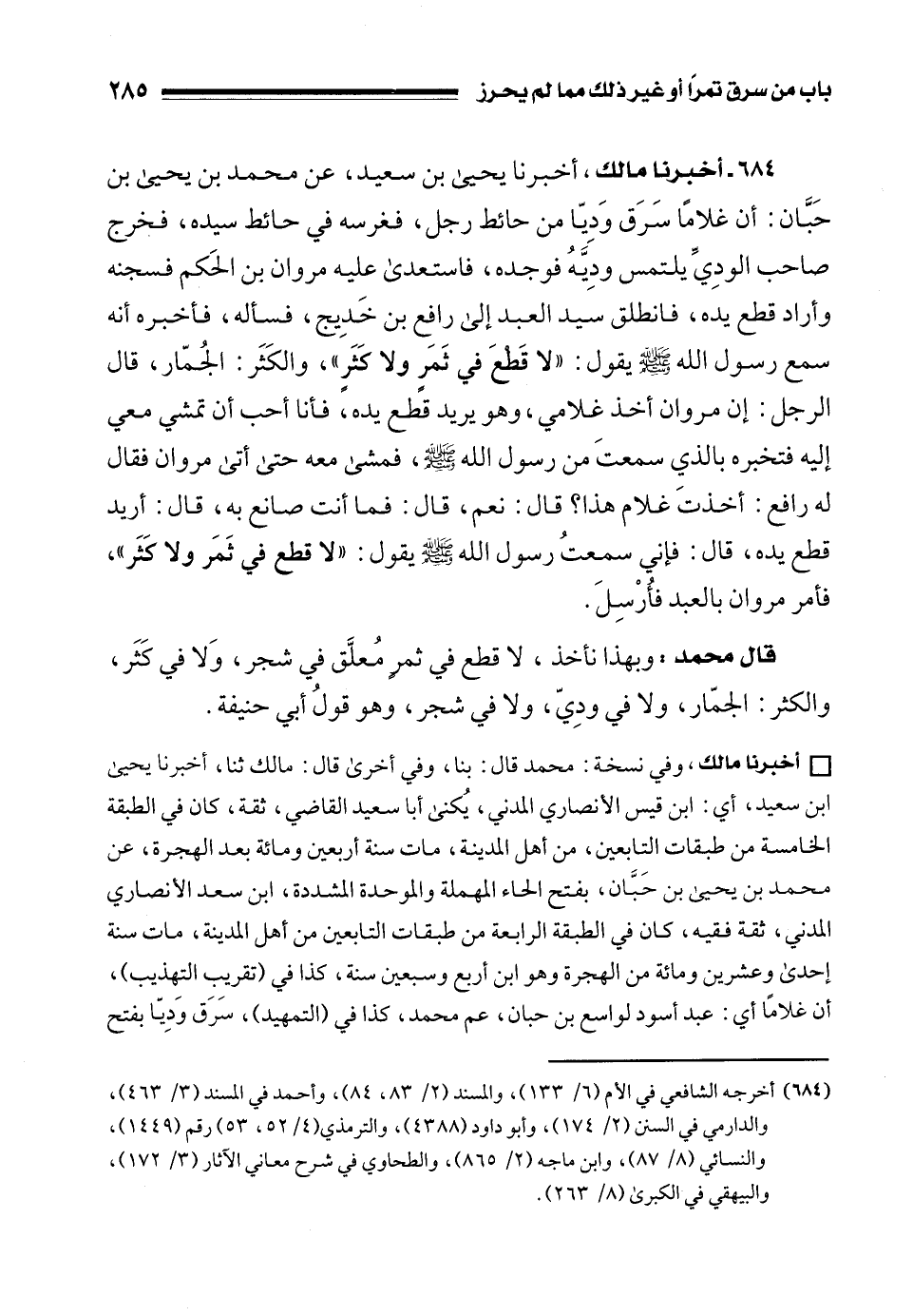 684 - أخبرنا مالك، أخبرنا يحيى بن سعيد، عن محمد بن يحيى بن حَبَّان: أن غلامًا سَرَق وَدِيّا من حائط رجل، فغرسه في حائط سيده، فخرج صاحب الودِيِّ يلتمس ودِيَّهُ فوجده، فاستعدى عليه مروان بن الحَكم فسجنه وأراد قطع يده، فانطلق سيد العبد إلى رافِع بن خَدِيج، فسأله، فأخبره أنه سمع رسول الله - صلى الله عليه وسلم - يقول: "لا قَطْعَ في ثَمَرٍ ولا كَثَرٍ"، والكَثَر: الجُمّار، قال الرجل: إن مروان أخذ غلامي، وهو يريد قطع يده، فأنا أحب أن تمشي معي إليه فتخبره بالذي سمعتَ من رسول الله - صلى الله عليه وسلم -، فمشى معه حتى أتى مروان فقال له رافع: أخذتَ غلام هذا؟ قال: نعم، قال: فما أنت صانع به، قال: أريد قطع يده، قال: فإني سمعتُ رسول الله - صلى الله عليه وسلم - يقول: "لا قطع في ثَمَر ولا كَثَر"، فأمر مروان بالعبد فأُرْسِلَ.