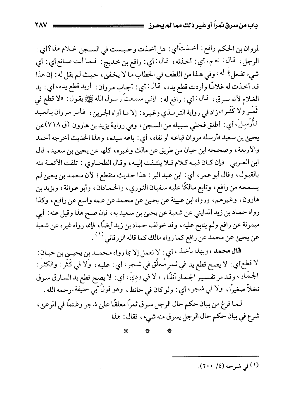 قال محمد: وبهذا نأخذ، أي: لا نعمل إلا بما رواه محمد بن يحيى بن حبان: لا قطع أي: لا يصح قطع يد في ثمرٍ مُعلَّق في شجر، أي: عليه، وَلا في كَثَر: والكثر: الجمّار، وقد مر تفسير الجمار آنفًا، ولا في ودِيّ، أي: لا يصح قطع يد السارق سرق نخلًا صغيرًا، ولا في شجر، أي: ولو كان في حائط، وهو قولُ أبي حنيفة - رحمه الله.