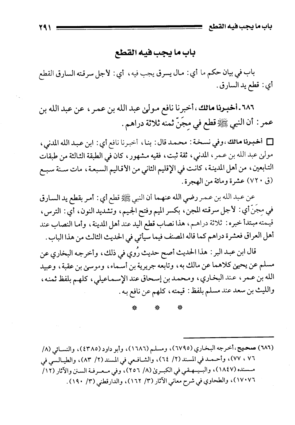 686 - أخبرنا مالك، أخبرنا نافع مولى عبد الله بن عمر، عن عبد الله بن عمر: أن النبي - صلى الله عليه وسلم - قطع في مِجَنّ ثمنه ثلاثة دراهم.