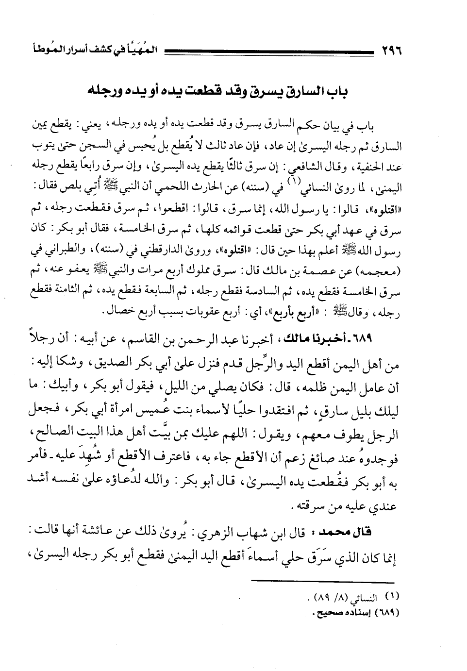 قال محمد: قال ابن شهاب الزهري: يُروى ذلك عن عائشة أنها قالت: إنما كان الذي سَرَق حلي أسماءَ أقطع اليد اليمنى فقطع أبو بكر رجله اليسرى،